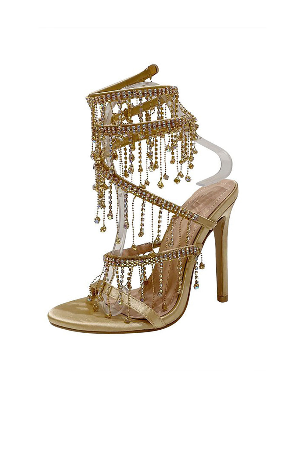• Golden Sparkly Strappy High Heeled Sandals With Tassel