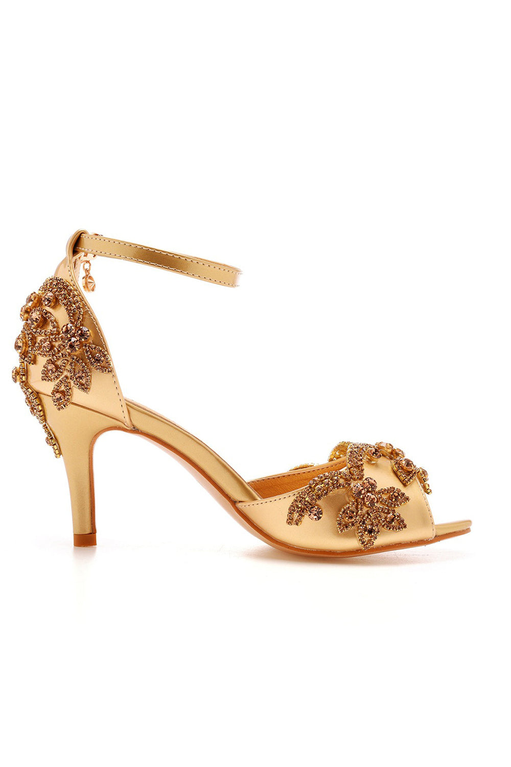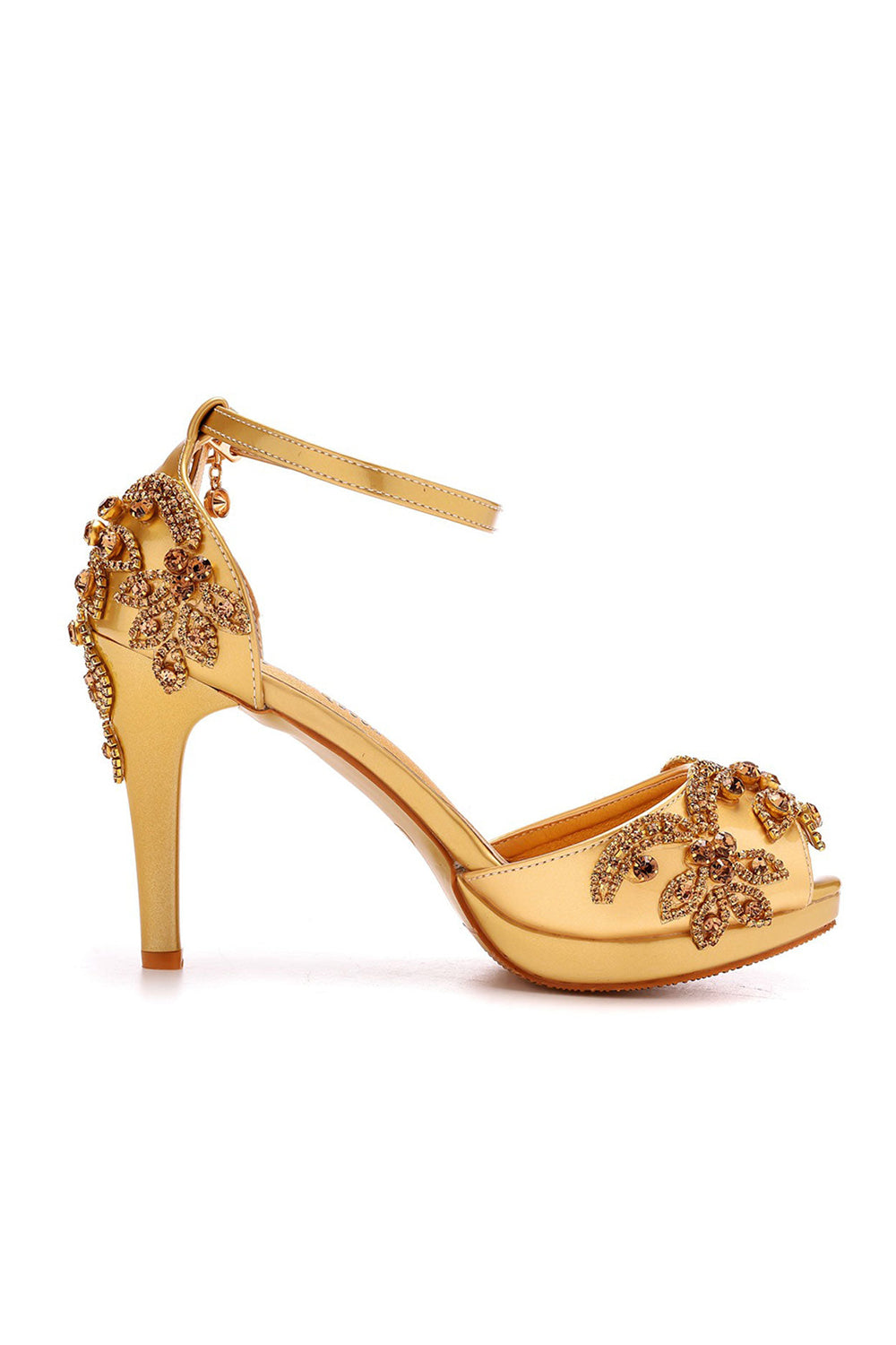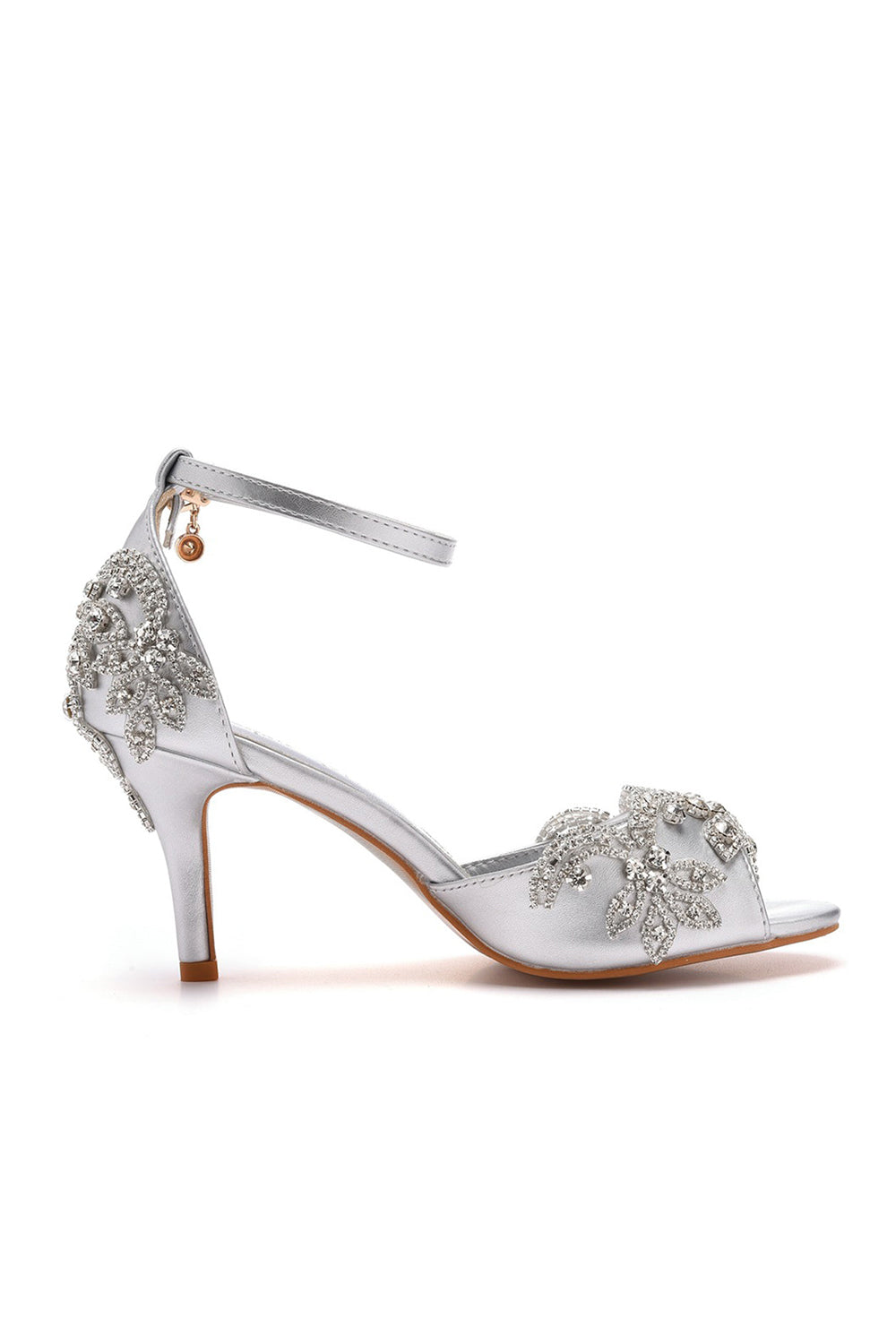 • Peep Toe Satin Rhinestone Ankle Strap High Heels