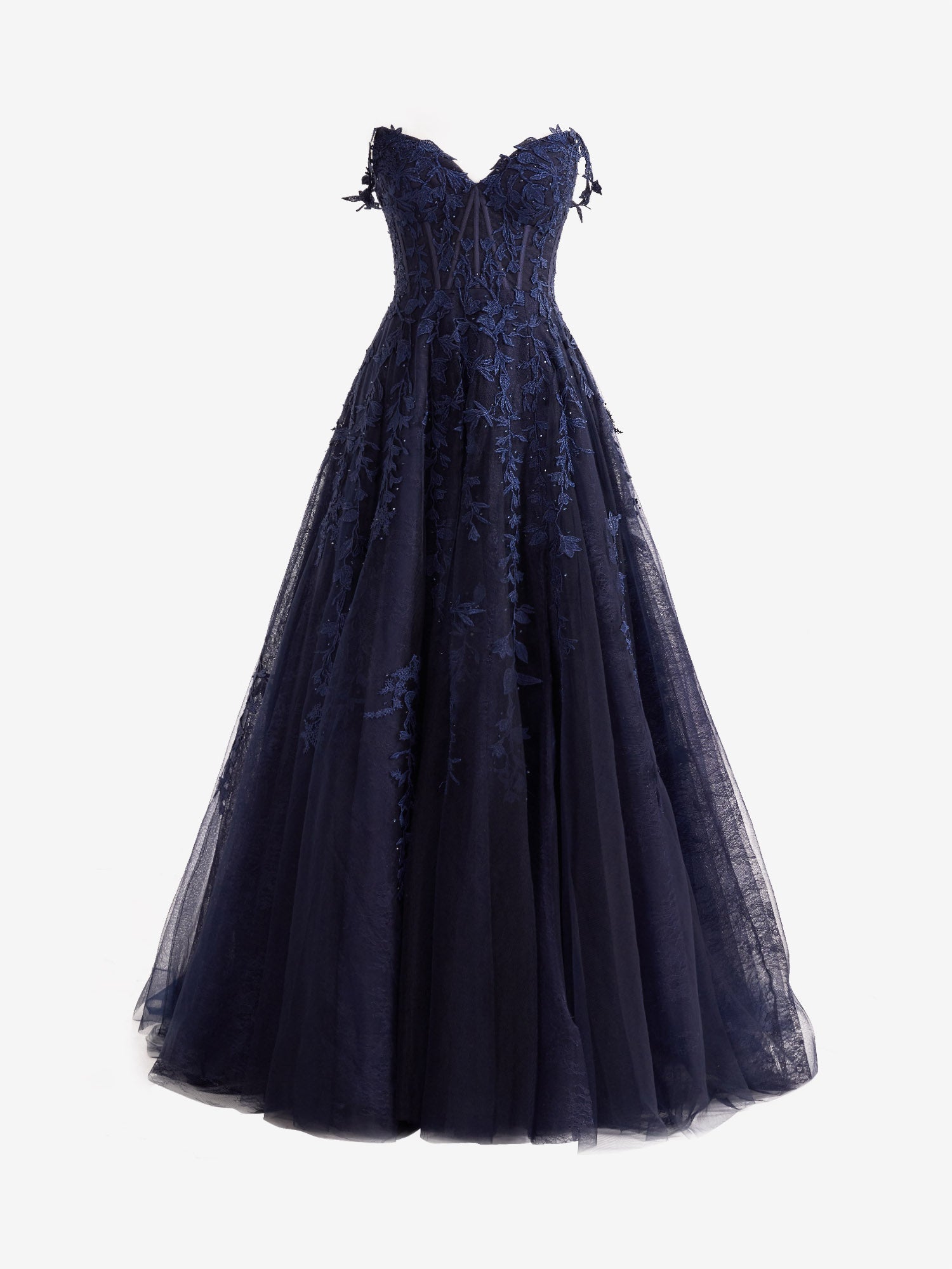 • Roycebridal Mariana |Navy Blue A-line Sweetheart Lace Tulle Prom Dress with Slit