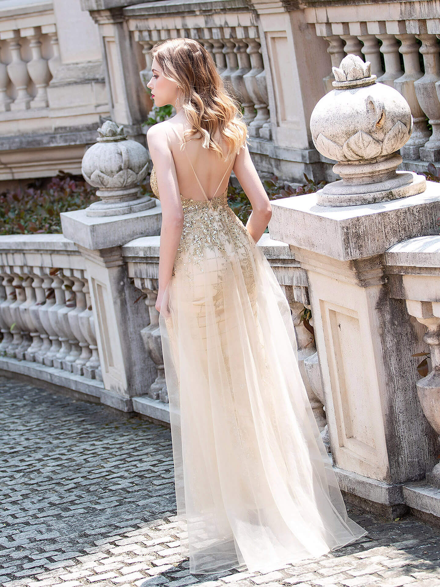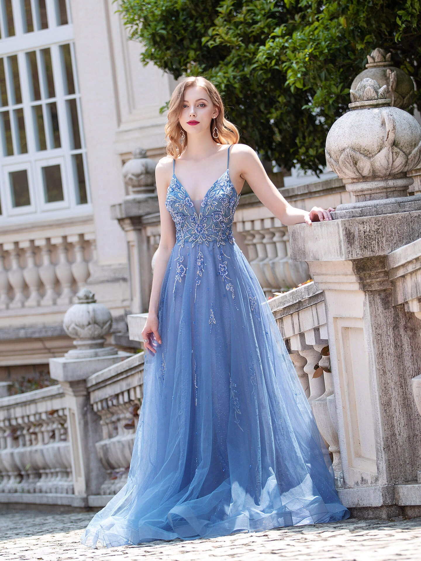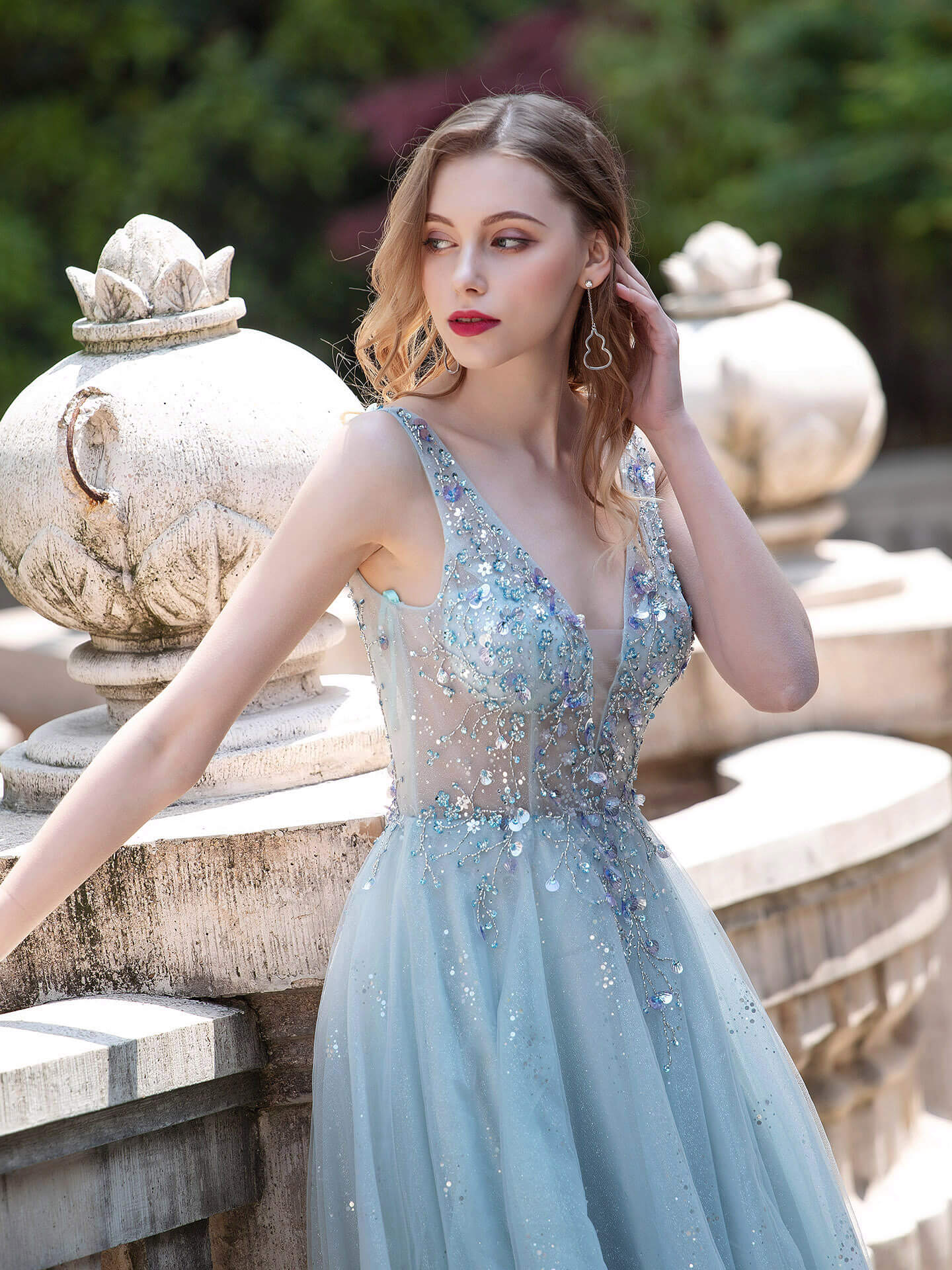 Roycebridal A-line Tulle V-neck Luxurious Sexy Formal Evening Dresses Sleeveless Floor Length