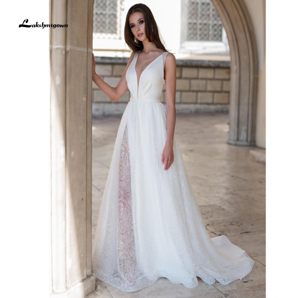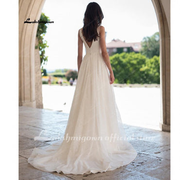 Roycebridal Lakshmigown Sexy Beach Wedding Dresses for Bridal 2021 Vestido Boda V-neck Off White Lace Bodice Boho Wedding Dress Sleevelss