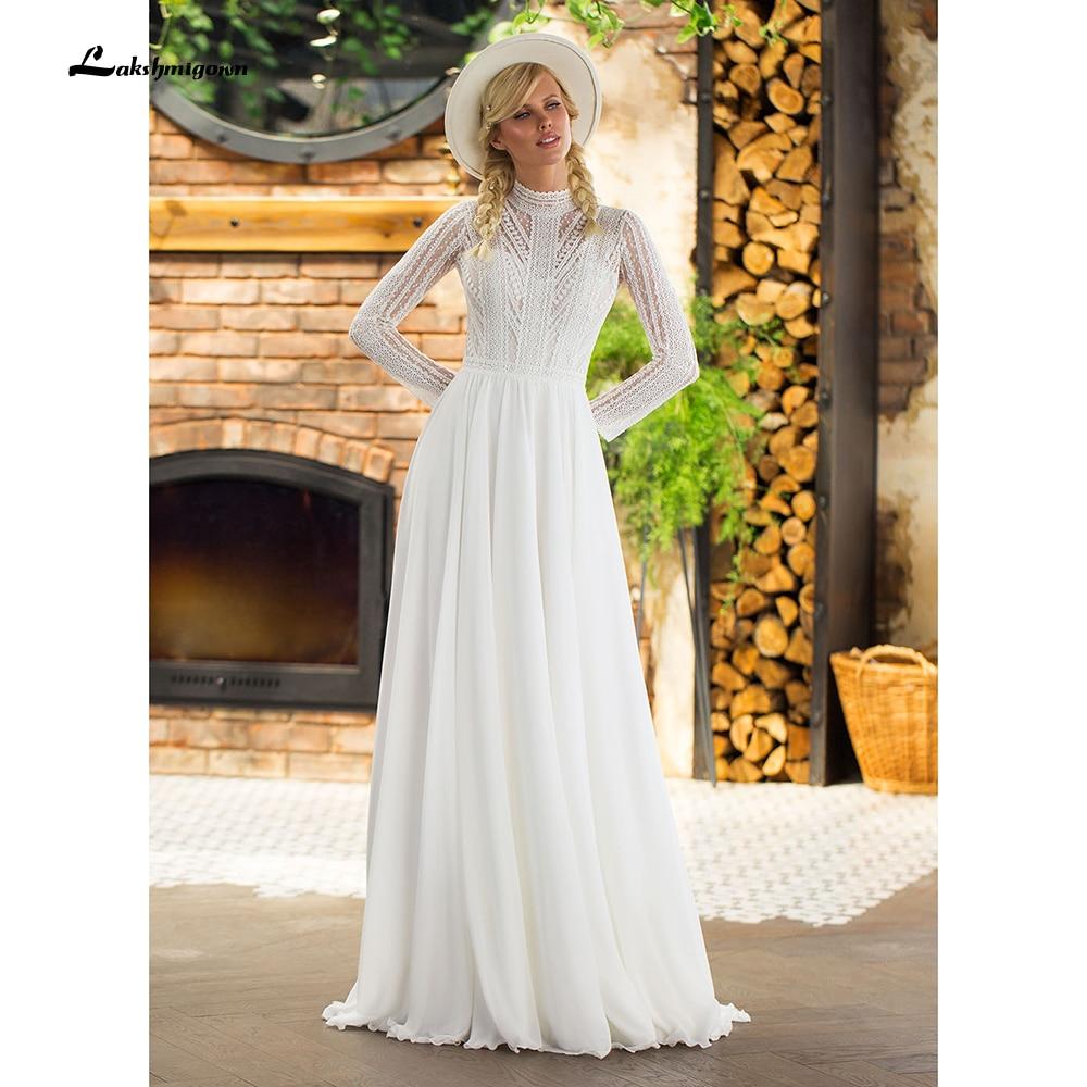 Roycebridal Long Sleeve High Neck Lace Chiffon A Line Wedding Dresses