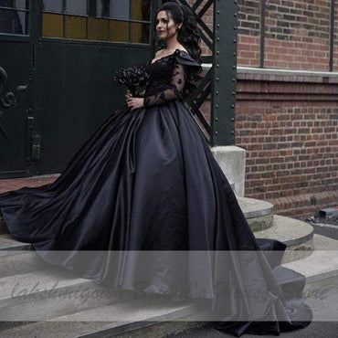 Style: Gothic BlackNeckline: One ShoulderBack Design: BacklessTrain: Sweep TrainFabric: Satin and lace