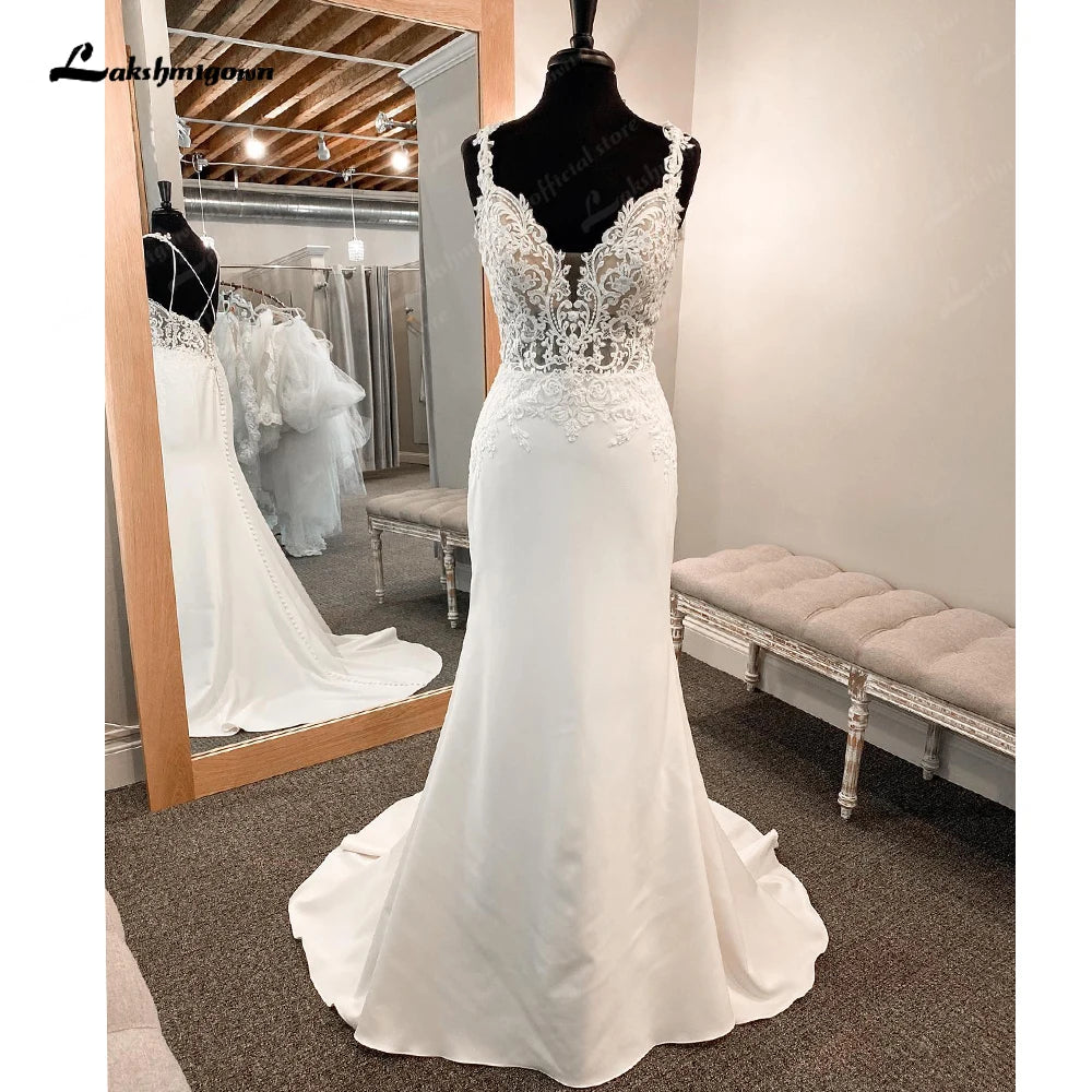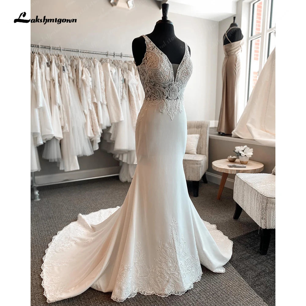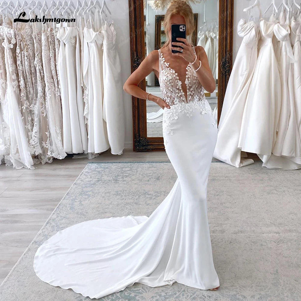 Roycebridal Deep V Neck Mermaid Wedding Dresses Elastic Satin Pearls Backless Bridal Gowns Beach Bride Dress robe de mariée