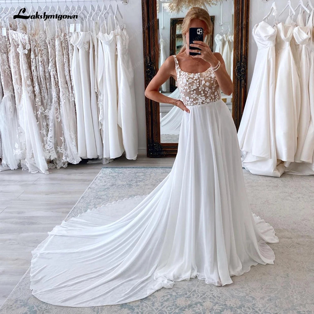 Roycebridal Lace Chiffon Wedding Dresses A-Line Appliques Scoop Neck Spaghetti Straps Bridal Gowns Princess Backless