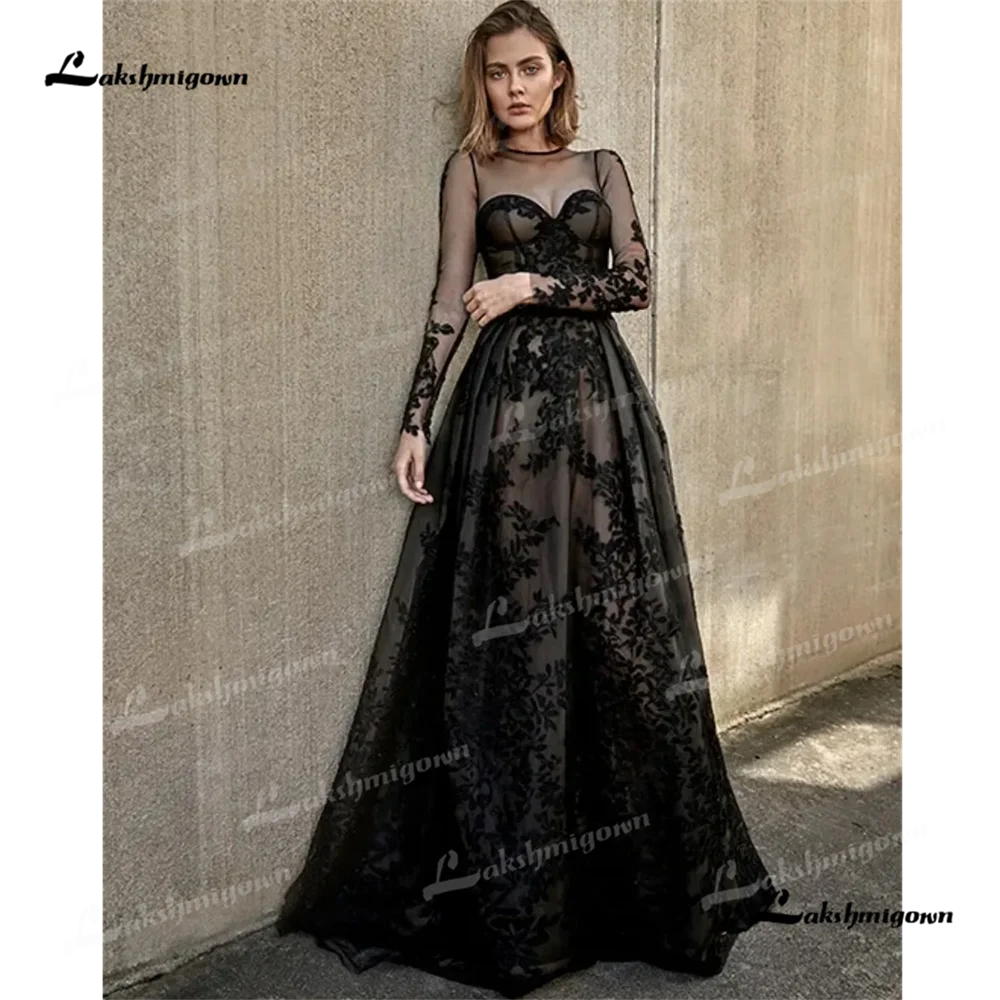 Roycebrial O Neck A Line Wedding Dress 2025 Lace Long Sleeves Backless Sweep Train Black Party dress
