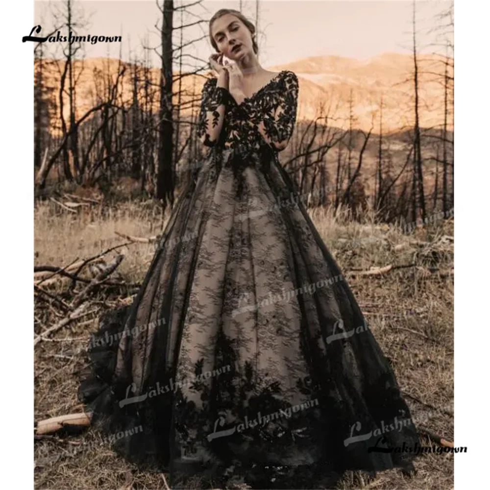 Roycebrial V Neck A Line Wedding Dress 2025 Lace Long Sleeves Backless Court Train Black Party dressesvestidos de fiestavestido