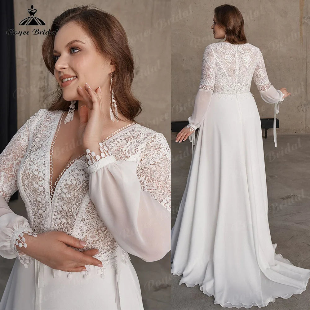 Roycebridal Bohemian Wedding Dresses Illusion Lace Bridal Gown Backless Long Sleeve Deep V Neck Boho Chiffon Plus Size Beach Bridal Dress