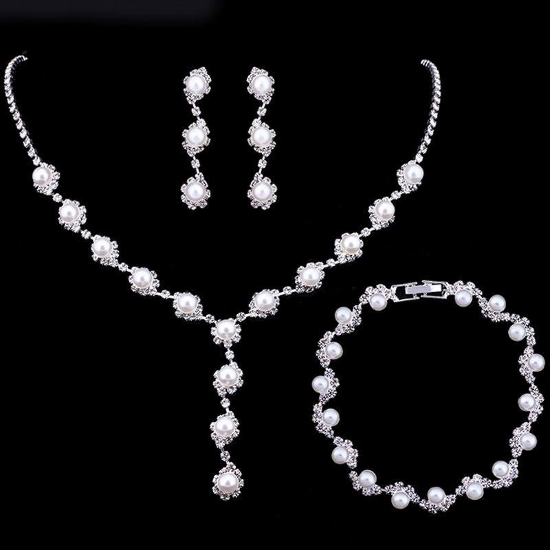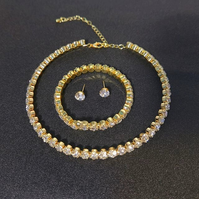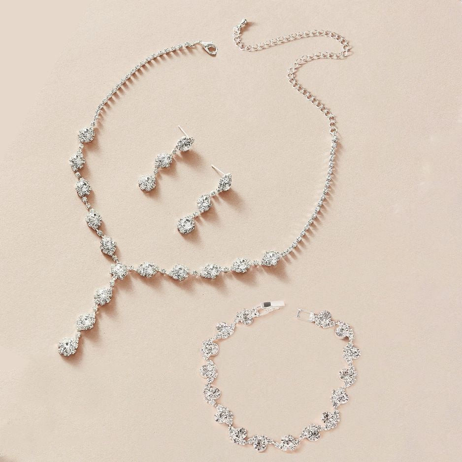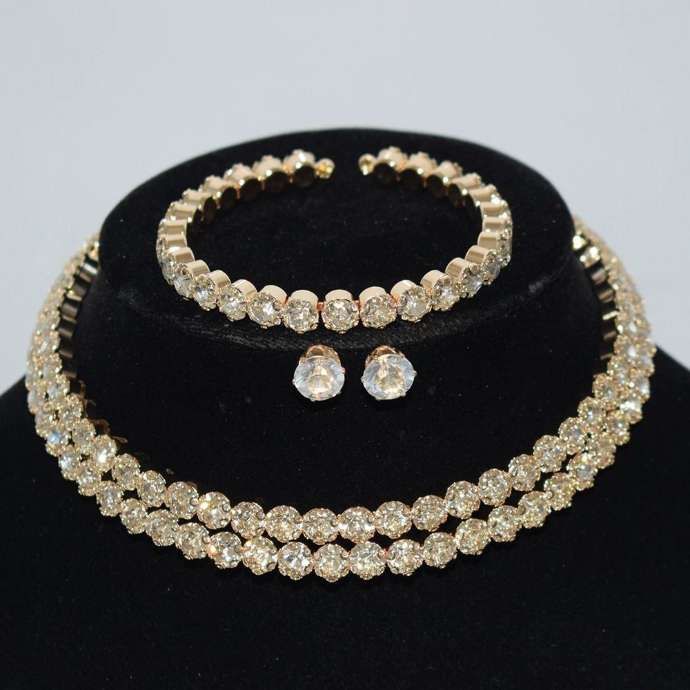 • Roycebridal Wedding Jewelry Set Three-piece Bride Rhinestone Double Row Earrings Necklace Bracelet Set Necklace Female Necklace Accessories