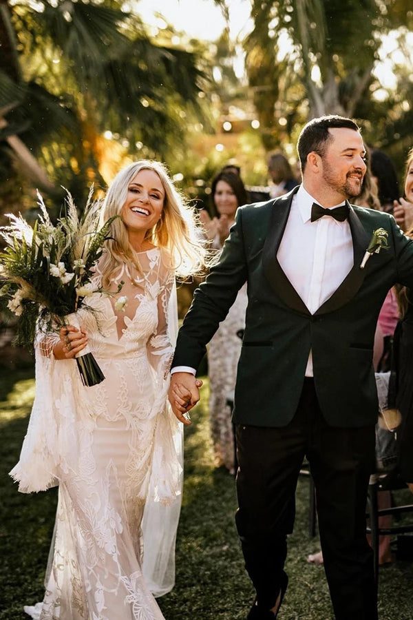Roycebridal Meerjungfrau Elfenbein Rückenfreies Langarm Spitze Brautkleider, MW283