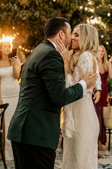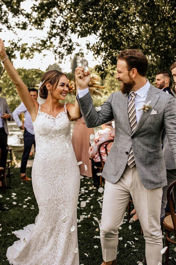 Roycebridal Schlichtes Brautkleid, rückenfreies V-Ausschnitt-Spitzen-Brautkleid, MW275
