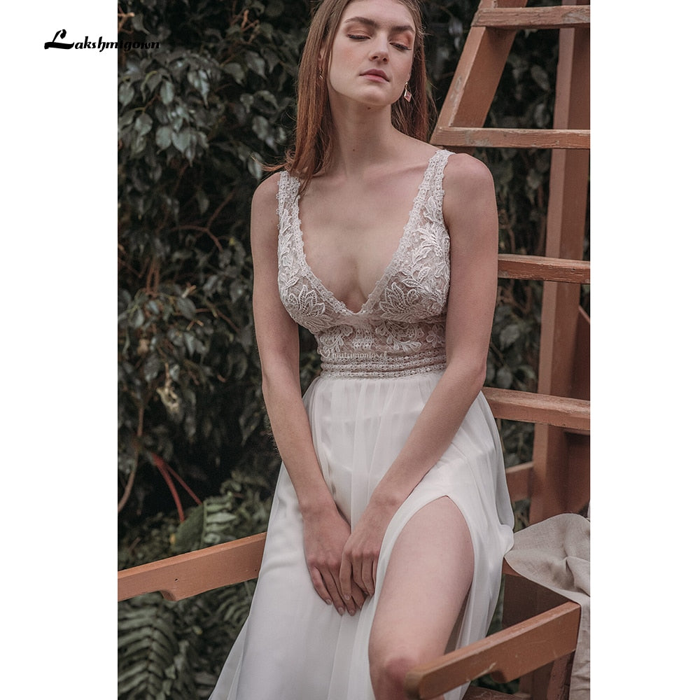 Roycebridal Hochzeitskleid im Boho-Stil, tiefer V-Ausschnitt, Ärmel, sexy Spitze, Chiffon, hoch gespalten, Strand-Brautkleid, Hochzeitskleid ohne Spitze