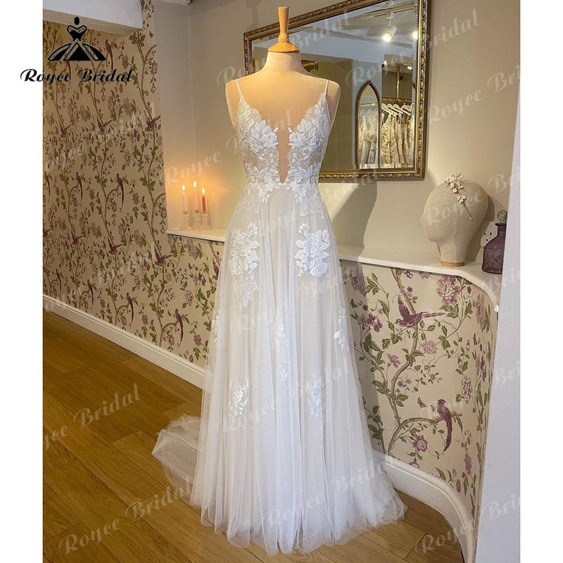 Roycebridal 2025 Robe Mariage A-Linie Boho Brautkleid mit V-Ausschnitt Spitze Applizierte Spaghettiträger Sweep Vestido Para Boda Playa Elegant
