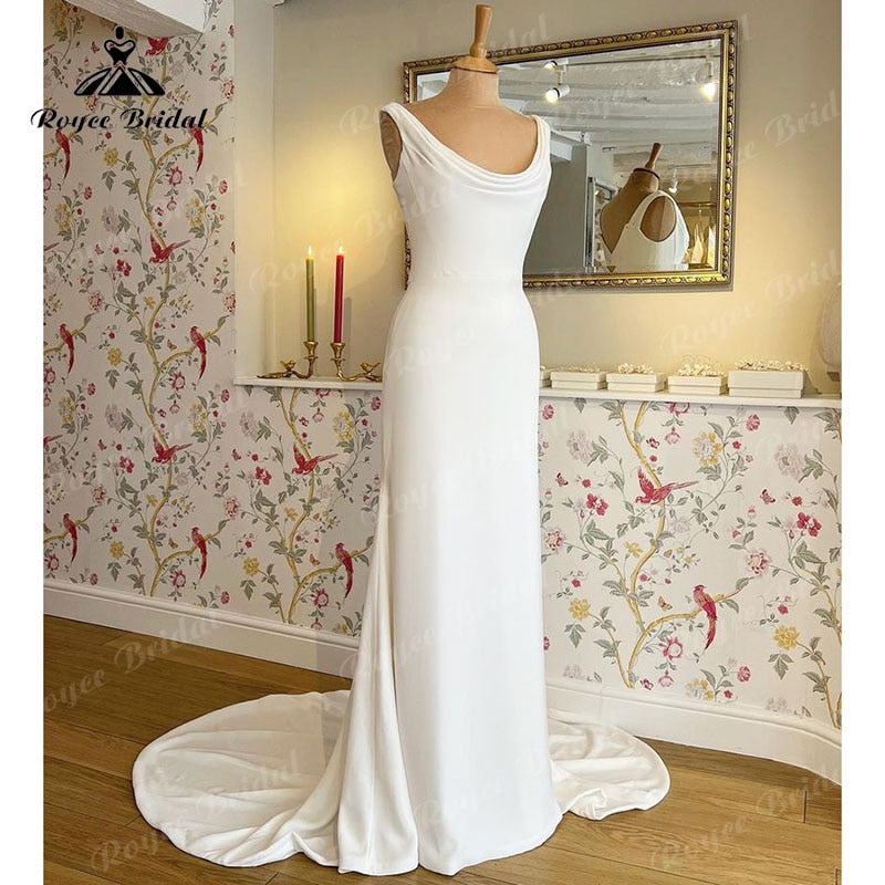Roycebridal Meerjungfrau/Trompete Boho Ärmelloses Brautkleid mit U-Ausschnitt, Strand-Sweep-Strand, Off White, weicher Satin, Vestido de Boda Corte Sirena