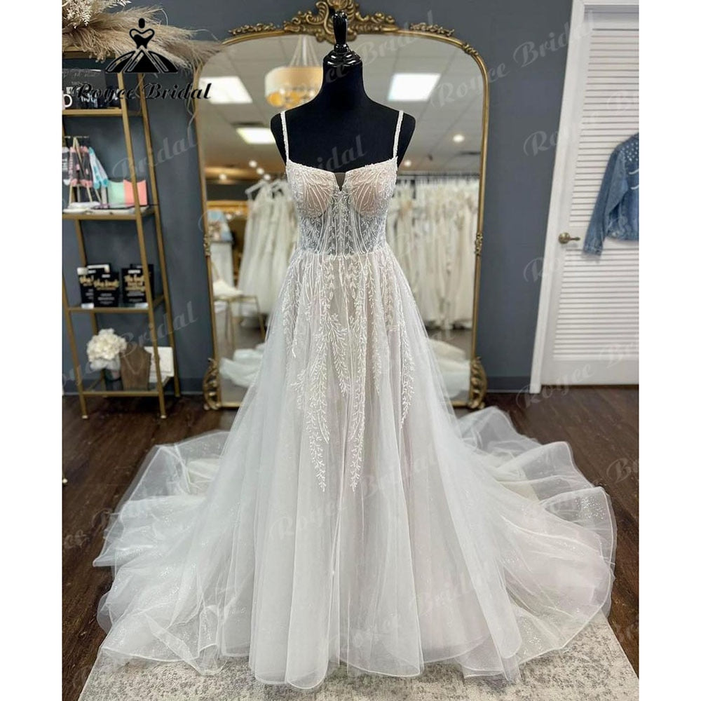 Roycebridal Roycebridal 2025 Spitzenapplikationen Spitze Glänzend Glitzer Spaghettiträger Brautkleid für Frauen Maßgefertigt Hofschleppe Rückenfrei
