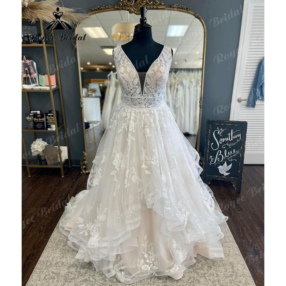 Roycebridal Plus Size V-Ausschnitt Spitzenapplikationen Prinzessin Hochzeitskleid Rückenfrei 2025 Brautkleid Robe Soirée Mariage Ärmellos