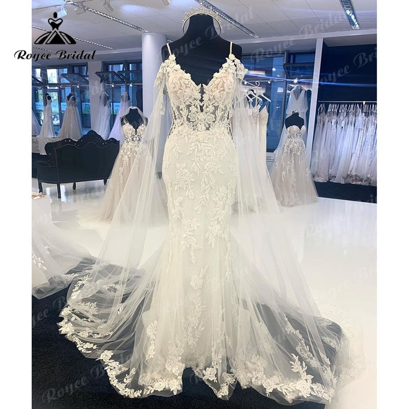 Roycebridal V-Ausschnitt Spaghettiträger Meerjungfrau Brautkleid mit Schal Applikationen Spitze Tüll Hofschleppe Rückenfreies Brautkleid 2025