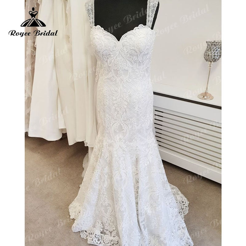 Roycebridal Vintage Meerjungfrau/Trompete Spitze Applikationen V-Ausschnitt Spaghettiträger Brautkleid mit abnehmbarer Schleppe Vestidos Sexy