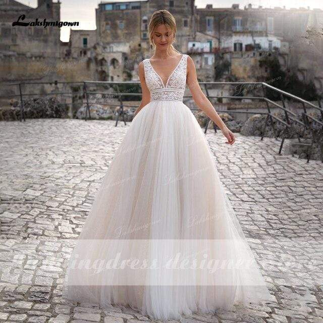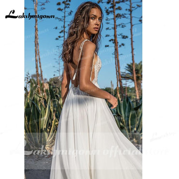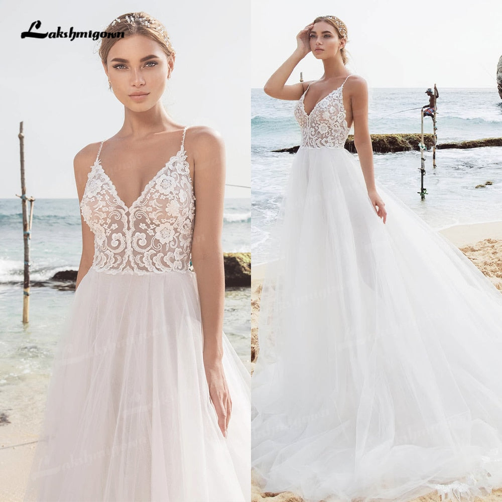 • Roycebridal Sexy Strand Spitze Brautkleider V-Ausschnitt Bohemian Spaghetti-Trägern Perlen Brautkleid Braut Zu Werden Luxruy Brautkleid Robe Mariee