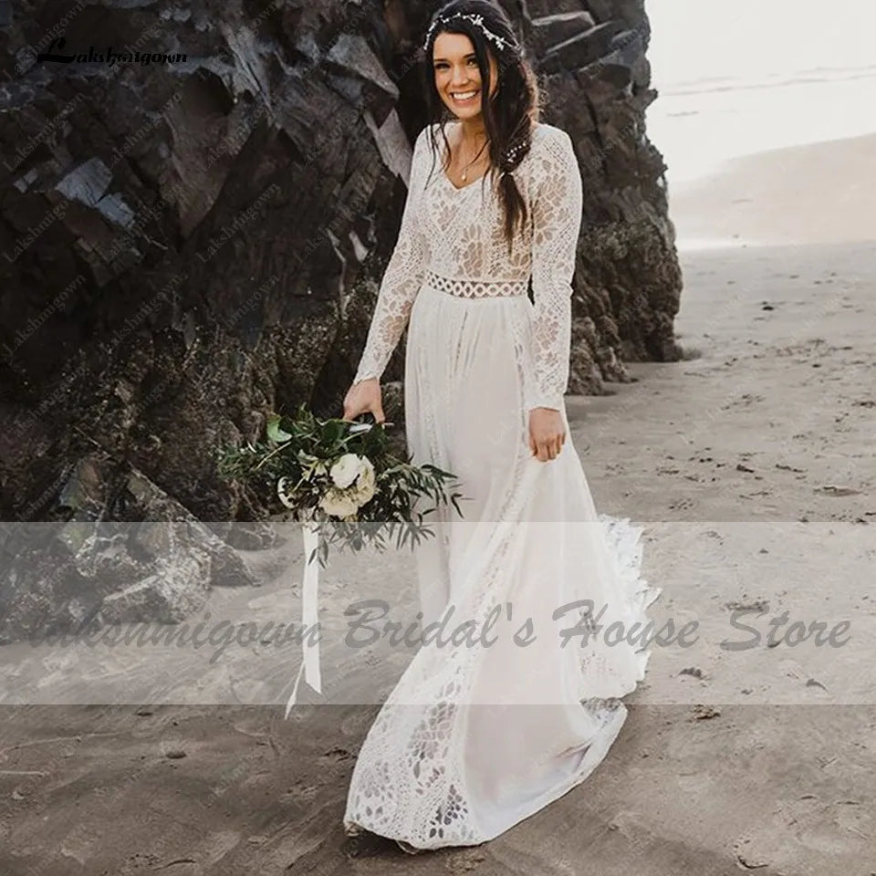 Roycebridal Hippie-Spitze Langarmkleid Brautkleid Sexy A-Linie Boho Brautkleider 2021 Plus Size Damen Strand Brautkleider
