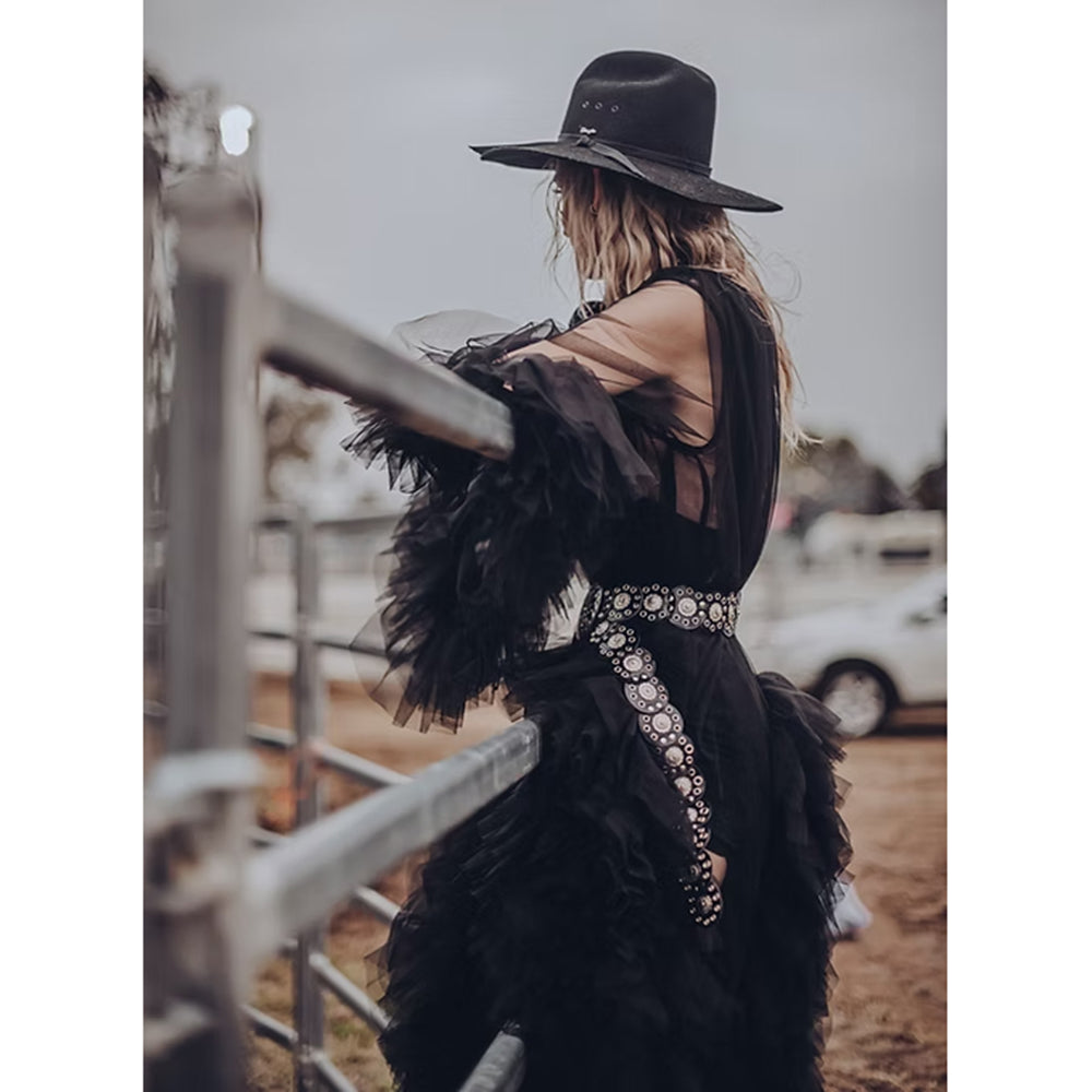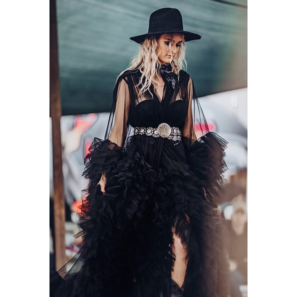 Verkörpern Sie Eleganz und Raffinesse in unserem schwarzen A-Linien-Brautkleid im Gothic-Stil mit V-Ausschnitt, langen Ärmeln und Spitzenbesatz. Der V-Ausschnitt, kombiniert mit aufwendigen Spitzendetails und Perlenakzenten, kreiert eine atemberaubende A-Linien-Silhouette – perfekt für eine Gothic-Hochzeit. Entdecken Sie die Königin in sich und setzen Sie ein Statement an Ihrem besonderen Tag.
