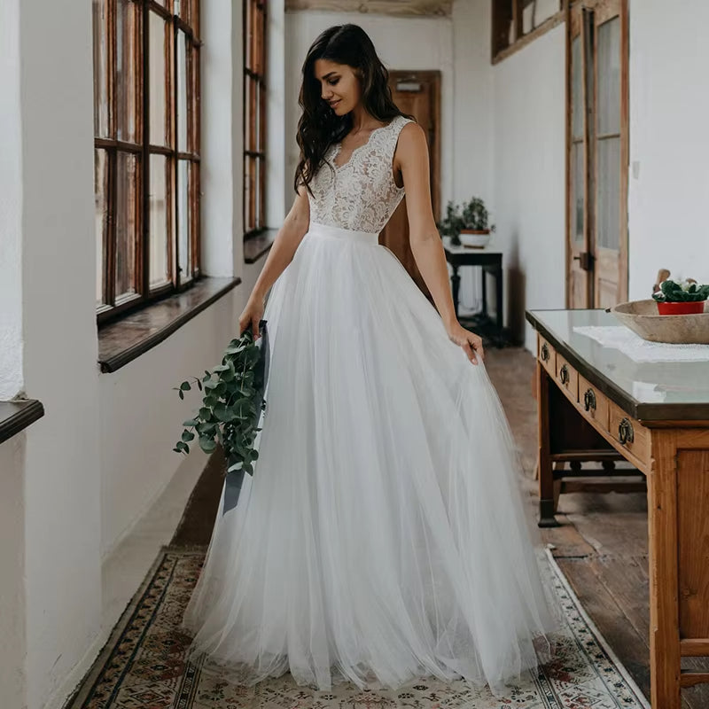 Country Lace V Neck Tulle Sleeveless Appliques A-Line Wedding Dress Custom Made Customized