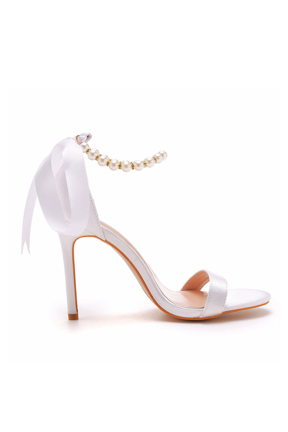 Escarpins à talons hauts en satin avec perles et bout ouvert et bride à la cheville