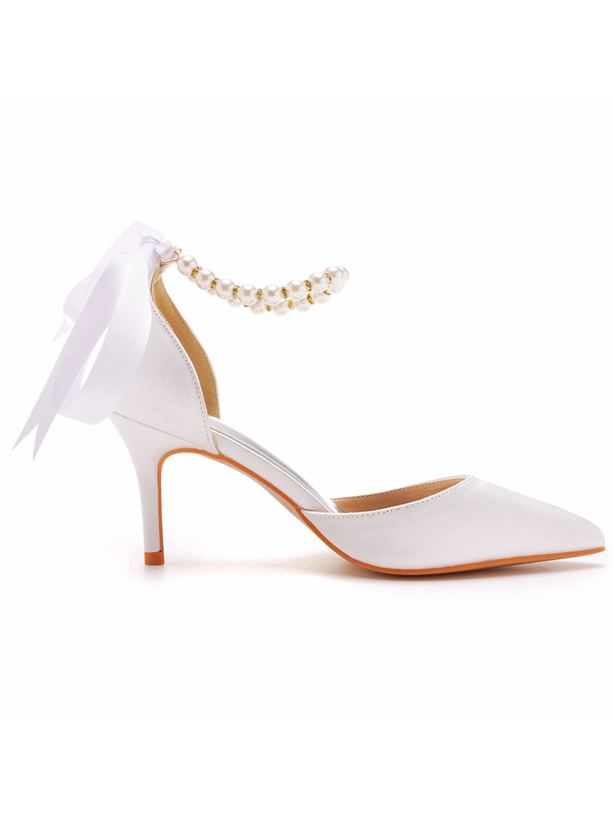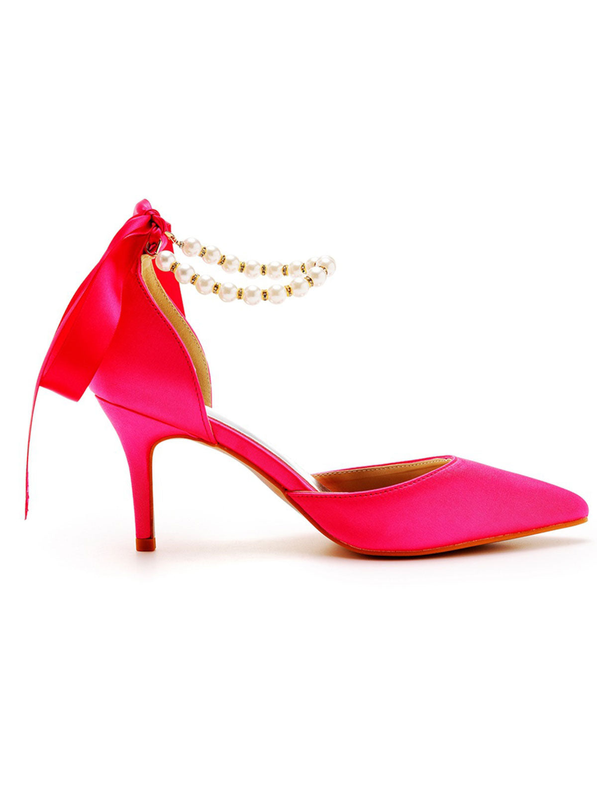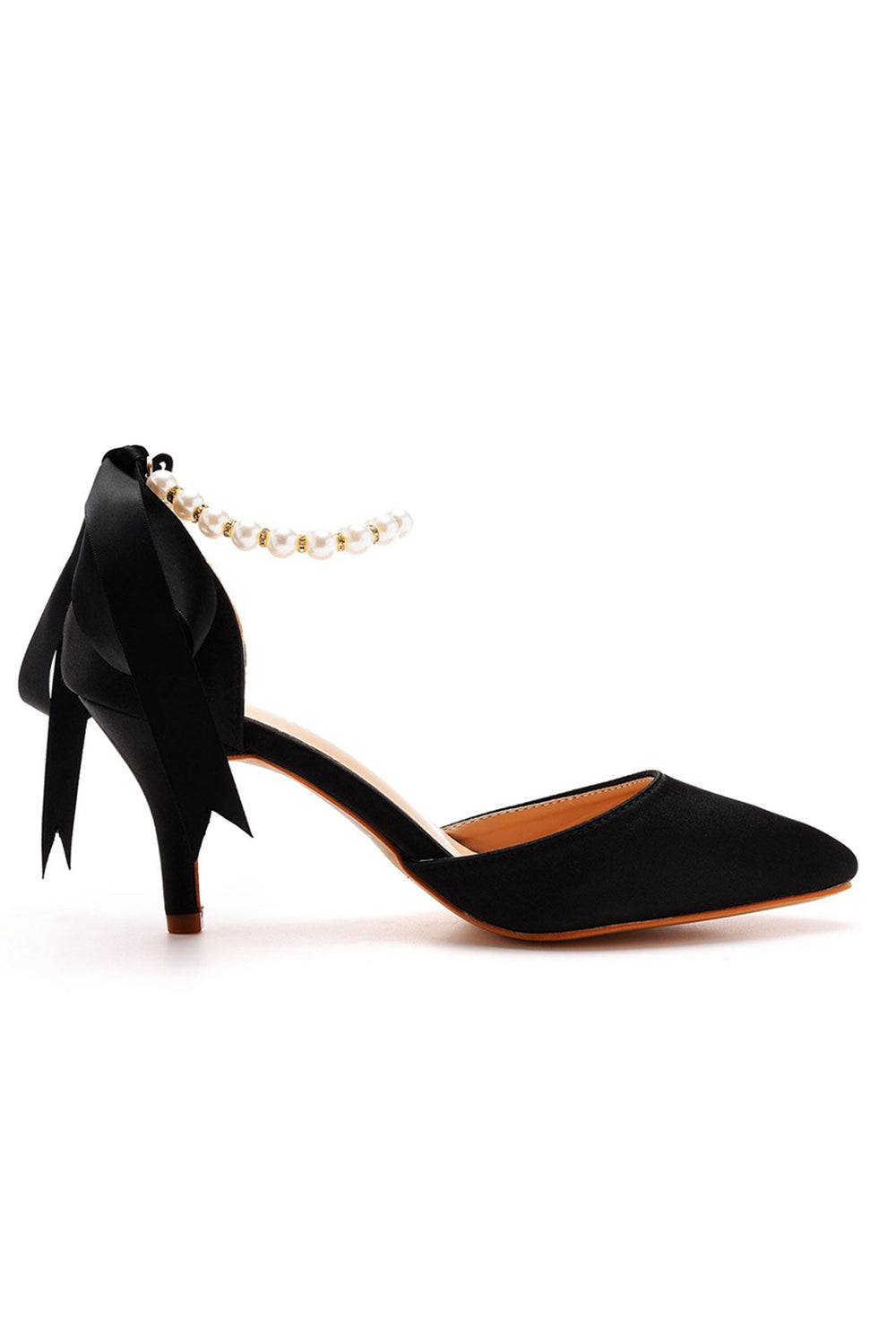 Talons hauts à bout pointu et bride à la cheville en satin avec ruban de perles