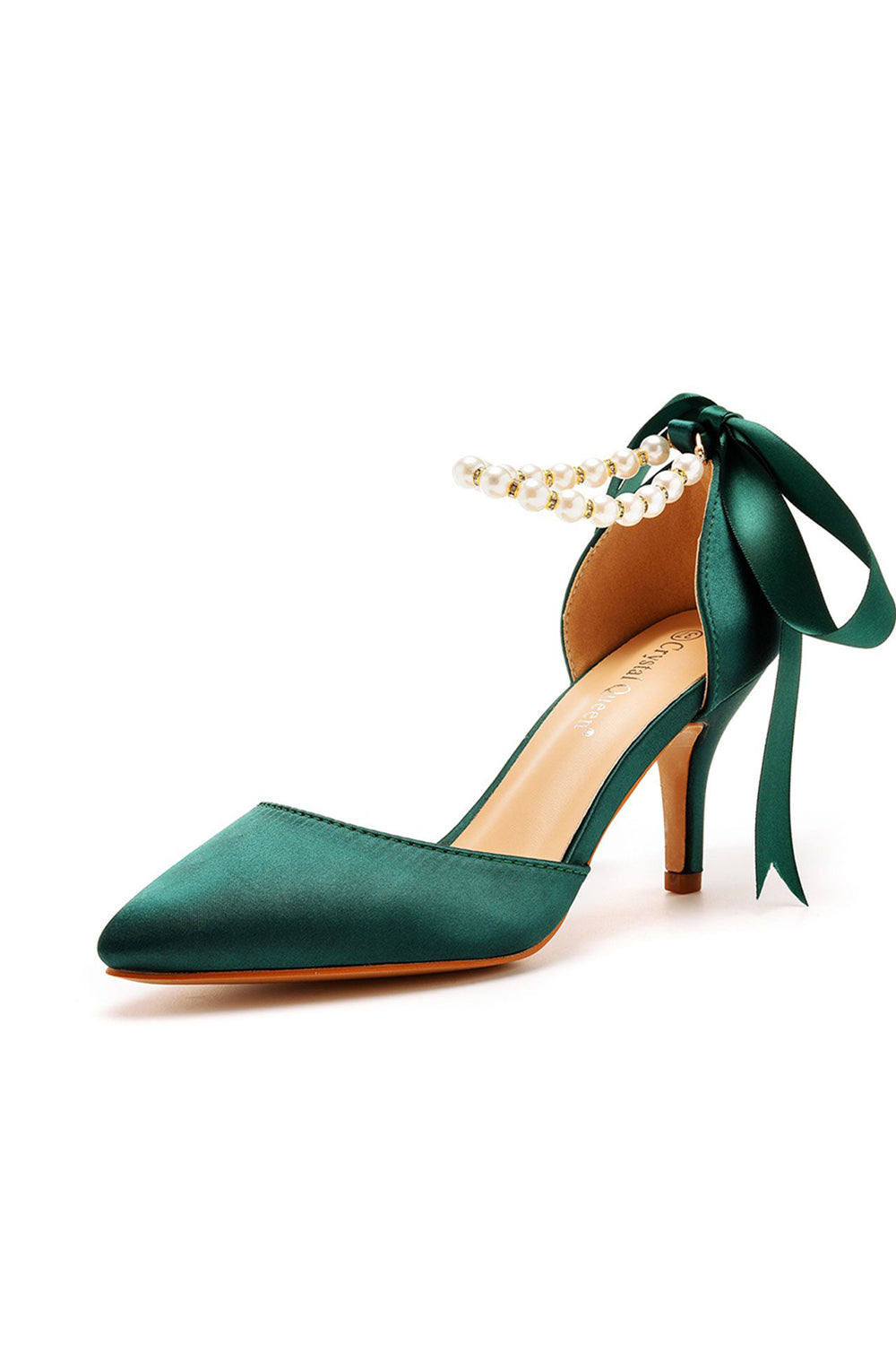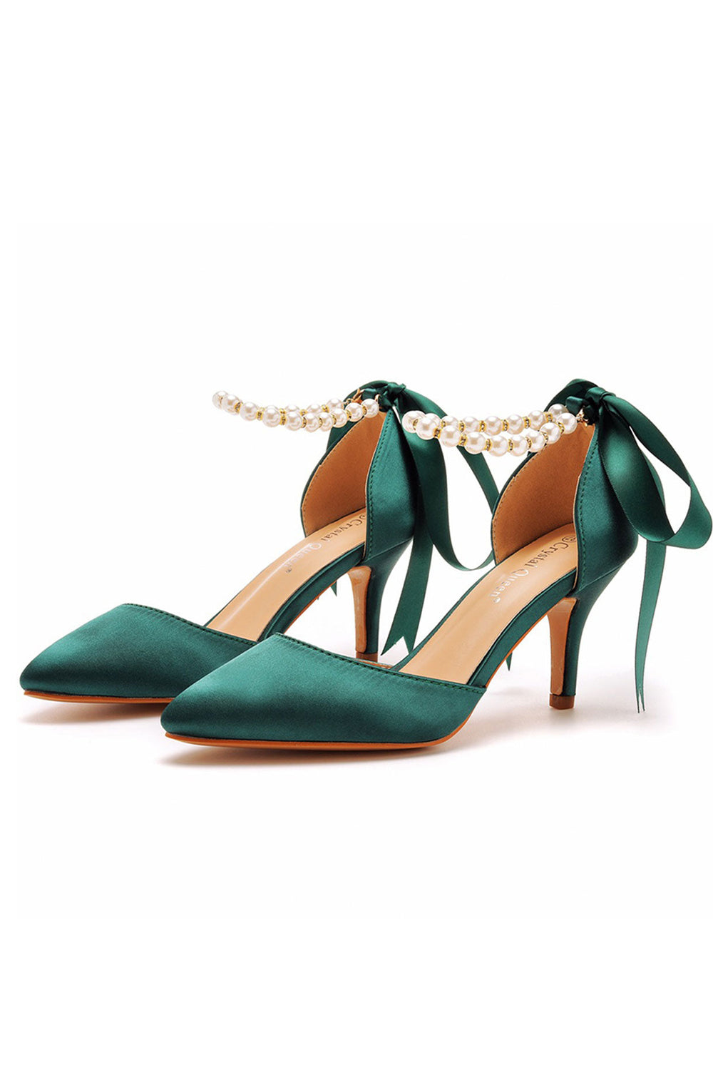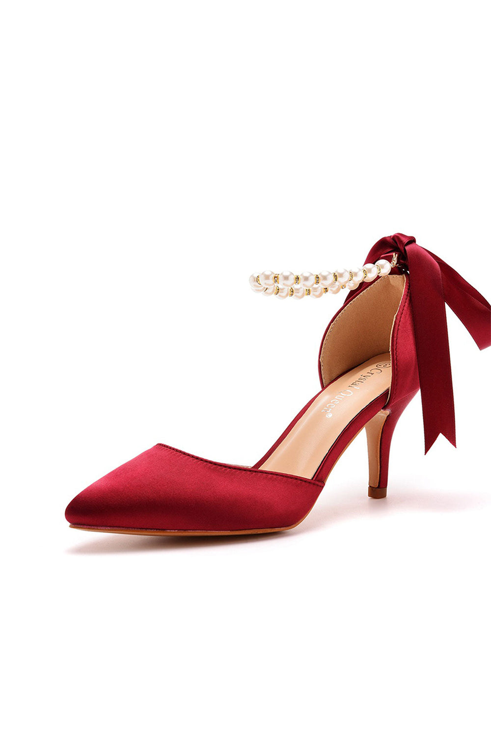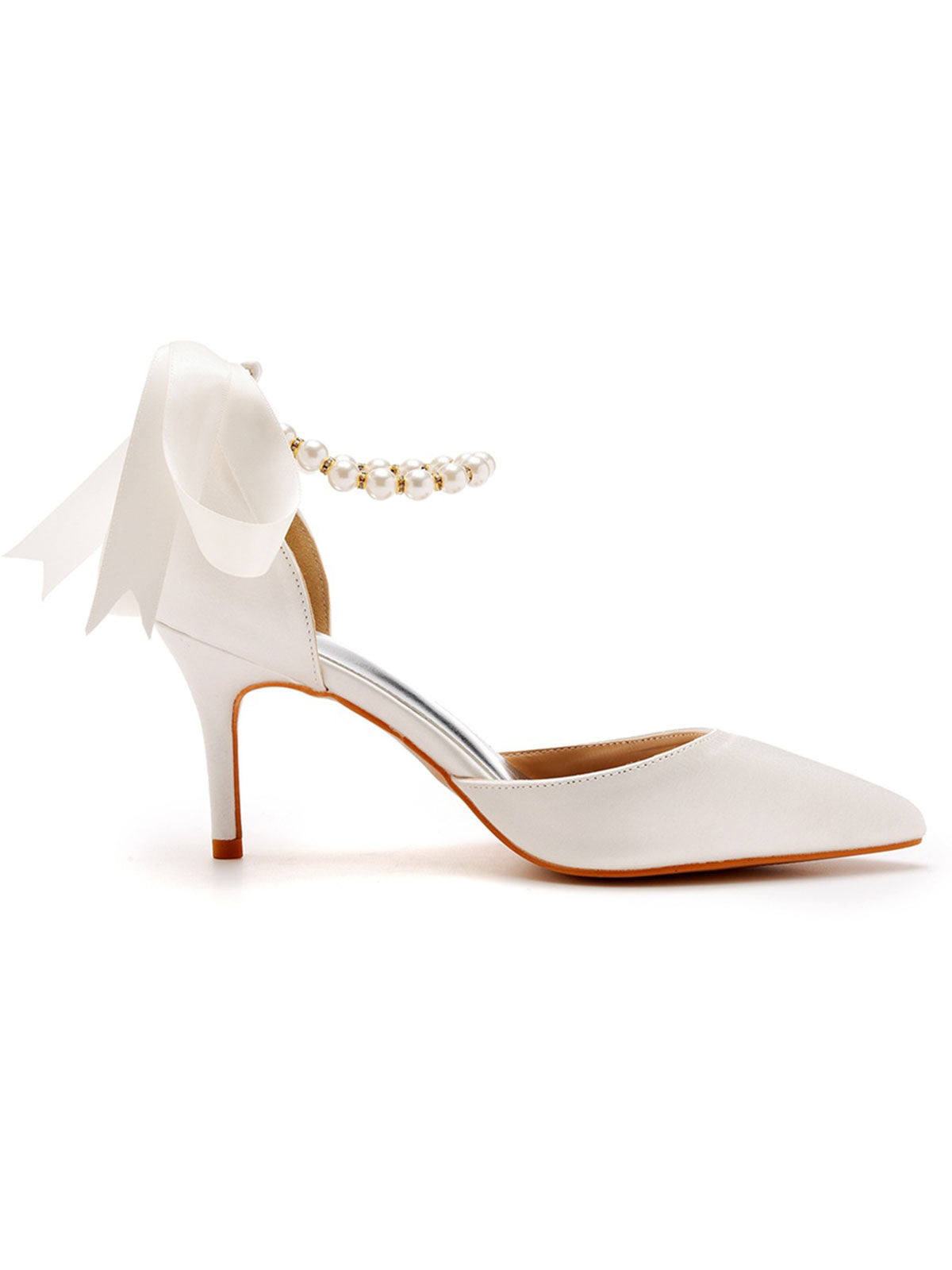 Talons hauts à bout pointu et bride à la cheville en satin avec ruban de perles