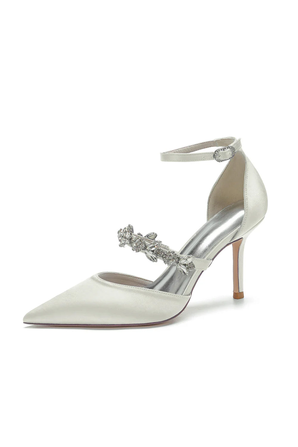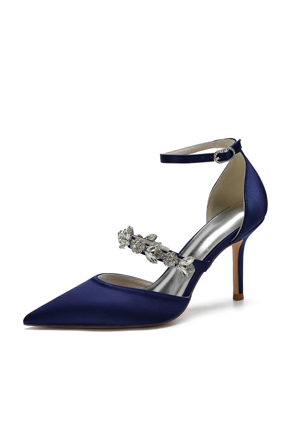 Escarpins à talons hauts en satin à bout pointu et bride en cristal