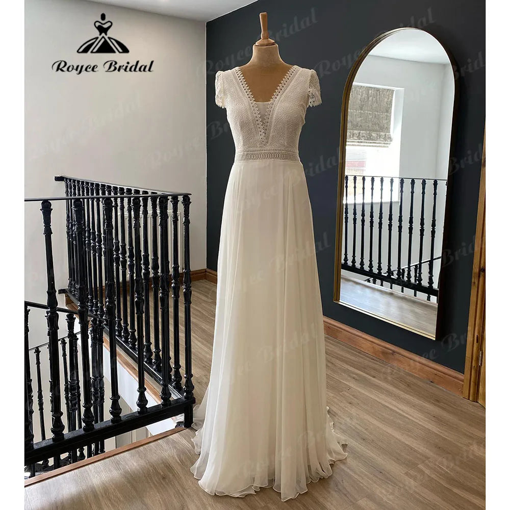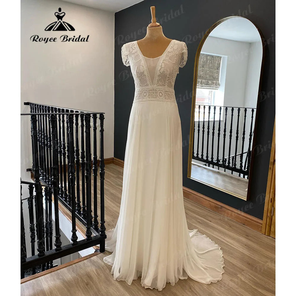 Robe de mariée bohème en mousseline de soie et dentelle, avec manches courtes, style bohème, 2024, Roycebridal