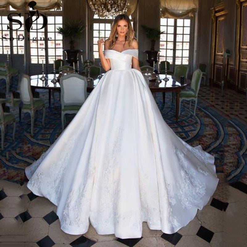 Robe de mariée princesse en satin SoDigne 2021, simple, épaules dénudées, style bohème, en dentelle, grande taille, longue traîne