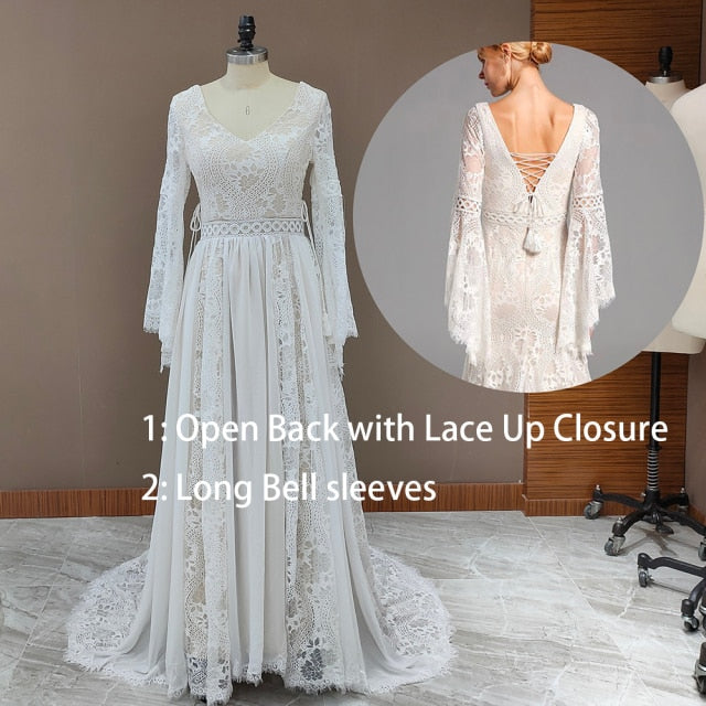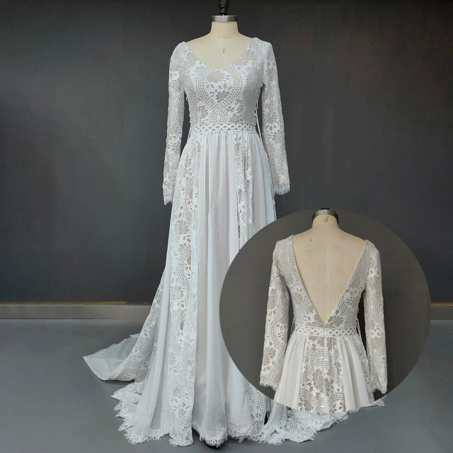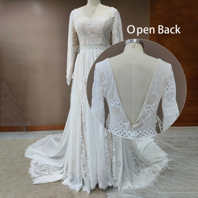 Robe de mariée vintage bohème en dentelle, dos nu, avec manches, style plage, style bohème, 2025