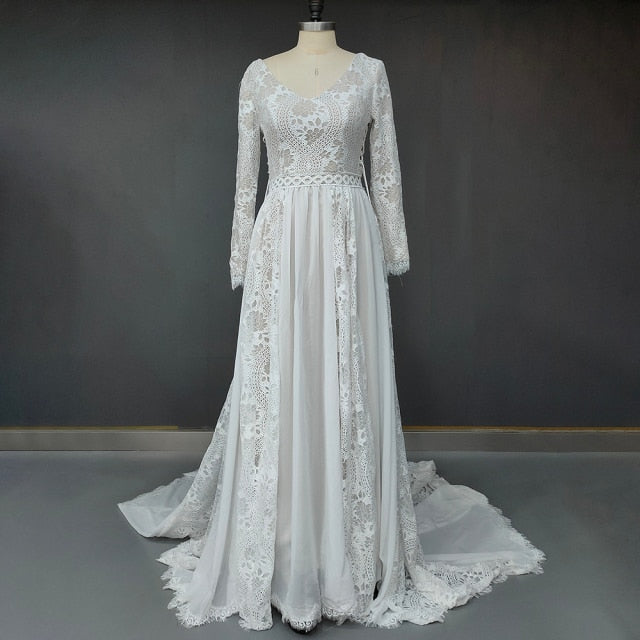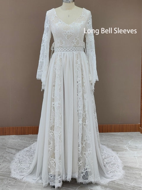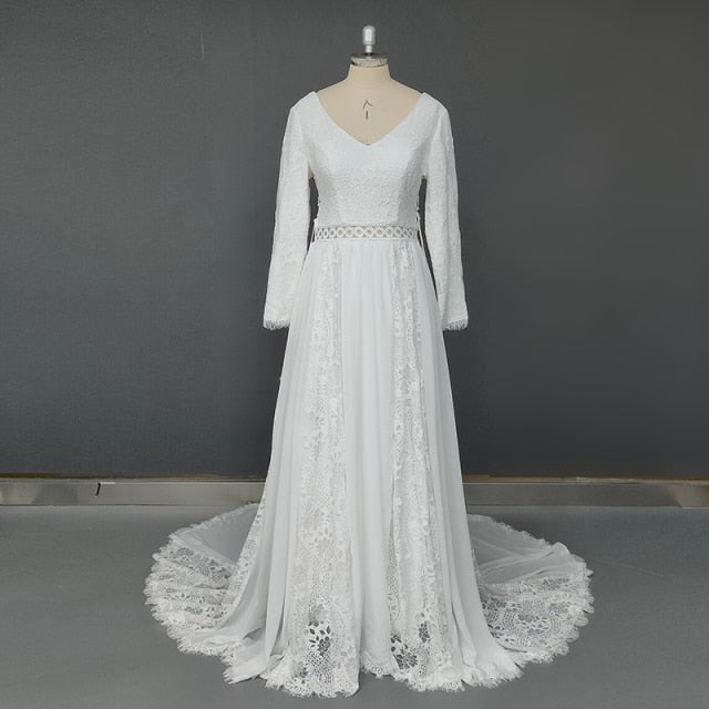 Robe de mariée style bohème, décolleté en V, dentelle, mousseline, coupe trapèze, manches longues, grande taille, style plage, 2022
