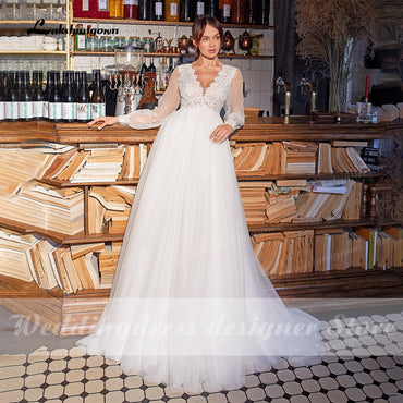 Roycebridal Vintage Plage Princesse Robes De Mariée À Manches Longues Robe De Bal Col Bateau Robe Mariee Blanc Boho Robes De Mariée robe de mariée