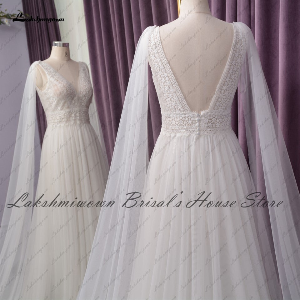 Roycebridal Lakshmigown Robe de plage sexy à col en V pour mariage d'été 2021 Robe de mariée chic style bohème avec cape sans manches