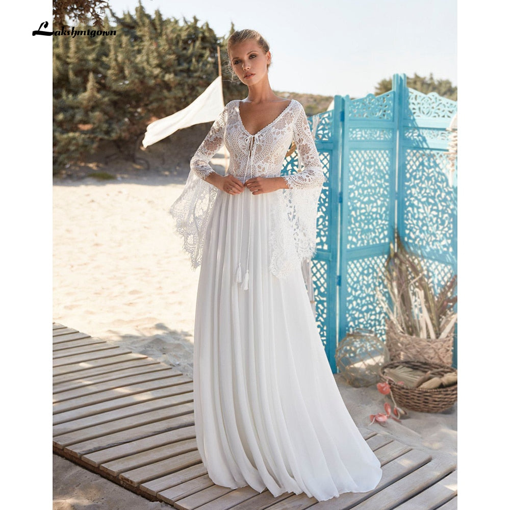 Roycebridal 2021 V Neck Lace Chiffon Bohemian Style Backless V Shape Back Wedding Dresses Flare Sleeve A Line Boho robe pour mariage plage