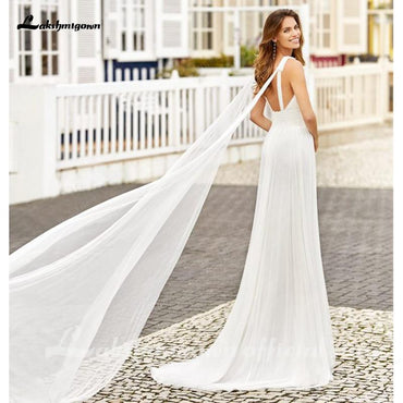 Robe de mariée simple en mousseline de soie à col en V et coupe trapèze style bohème