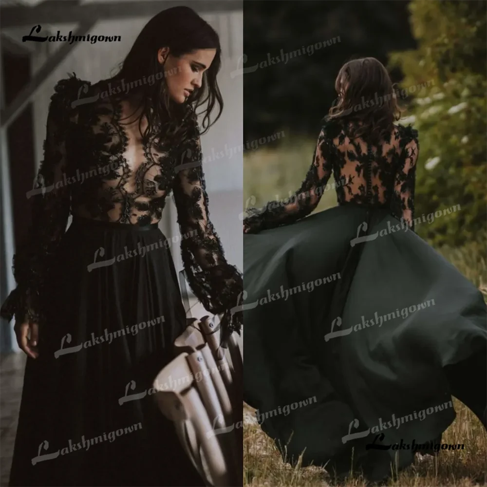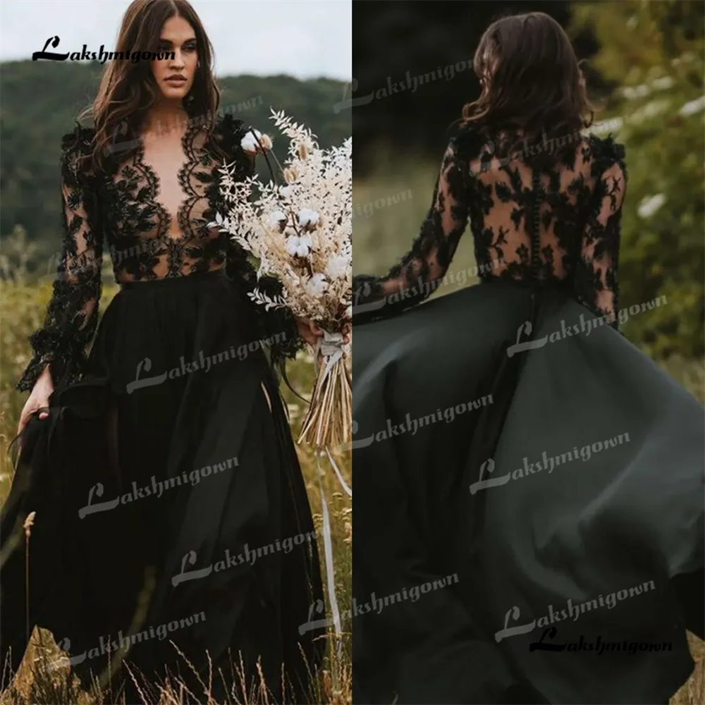 Robe de mariée trapèze à col en V Roycebrial 2025, en dentelle, manches longues, dos nu, traîne courte, noire, robes de soirée