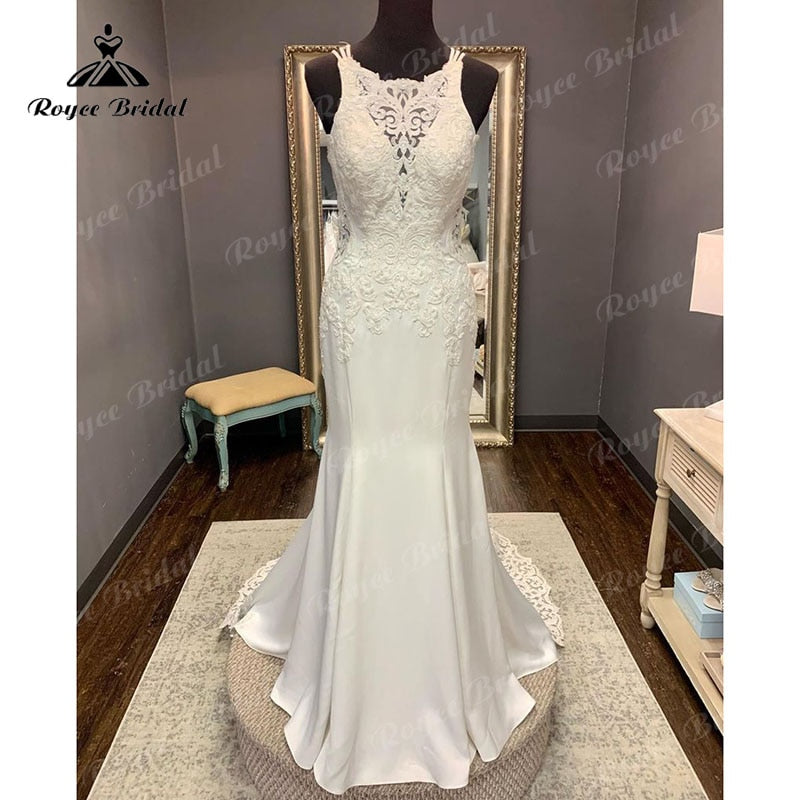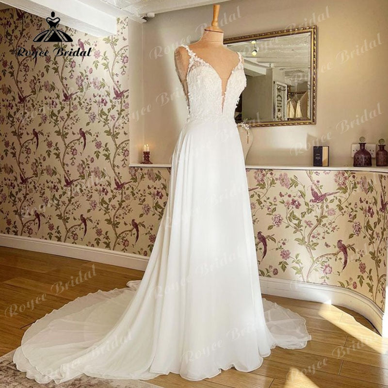 Roycebridal Robe de mariée trapèze en dentelle, col rond, appliques de plage, mousseline de soie, style bohème, dos nu, sexy, élégante, été, 2025