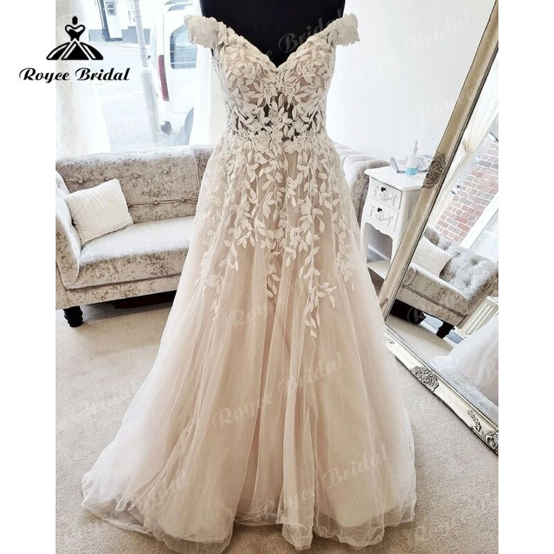 Robe de mariée trapèze modeste à épaules dénudées et appliques en dentelle, col en V, robe de plage chic, robe de mariée sur mesure pour femmes, 2025