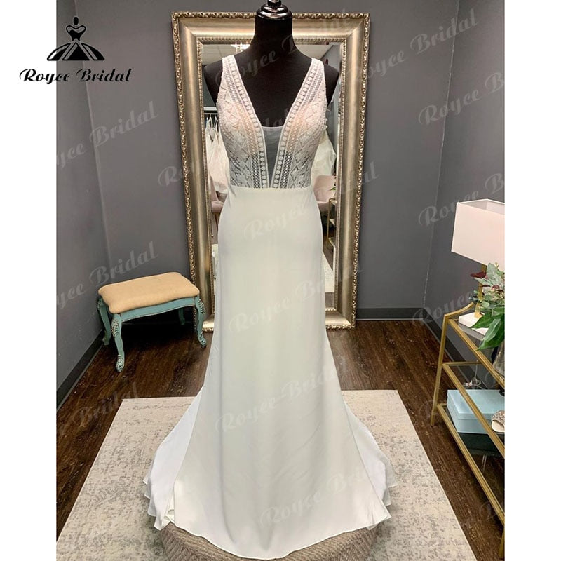 Robe de mariée bohème style sirène, col en V, bretelles spaghetti, style vintage, style bohème, sur mesure, 2025