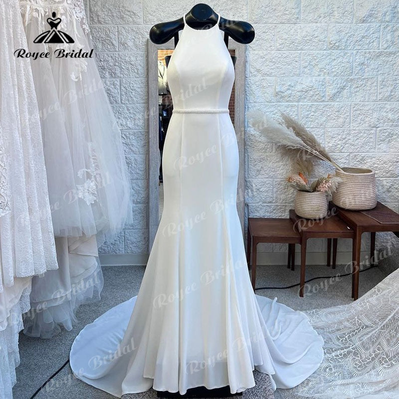 Robe de mariée sirène/trompette style bohème sans manches, col rond, balayage plage, blanc cassé, satin doux