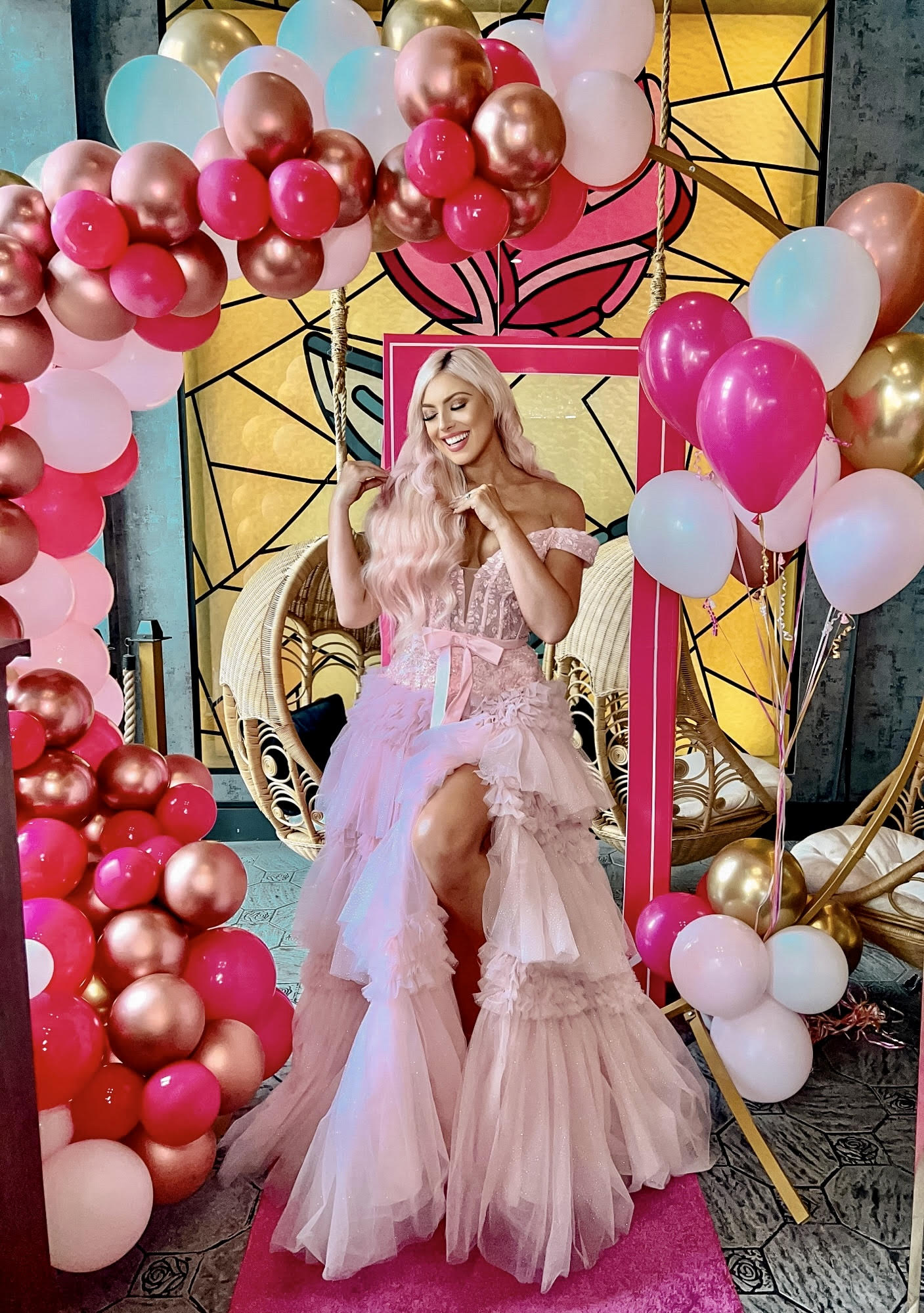 Robe de bal longue rose clair à volants style princesse coupe trapèze et épaules dénudées