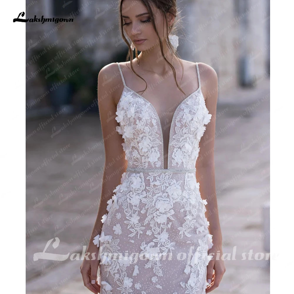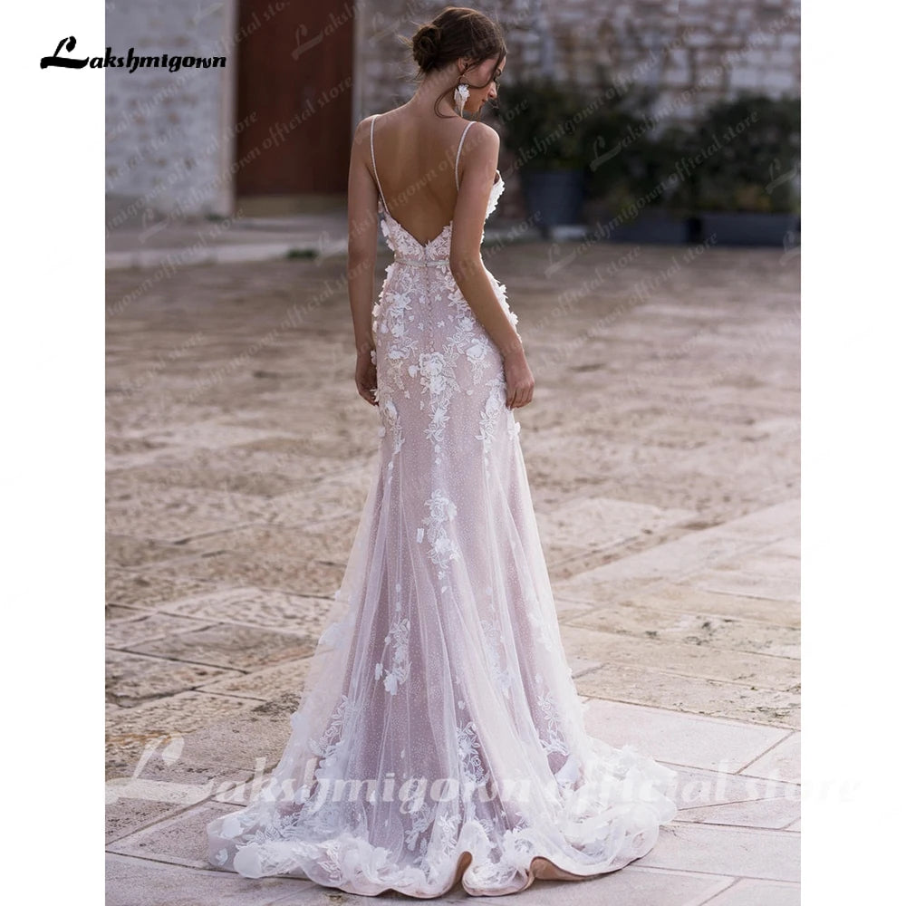 Robe de mariée sirène sexy à décolleté en V profond et bretelles spaghetti, avec perles et cristaux, avec appliques 3D