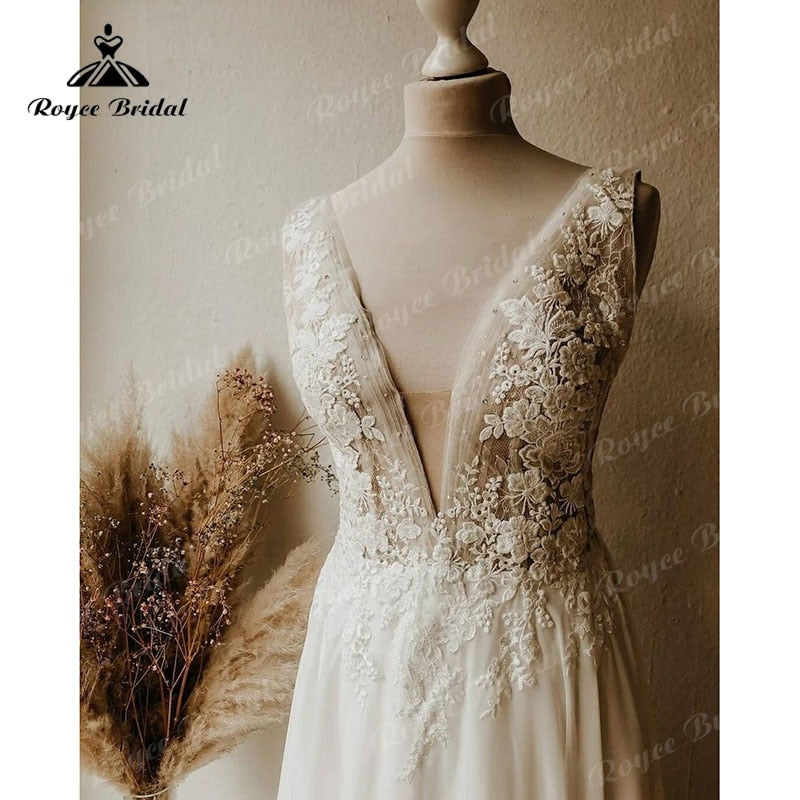 Robe de mariée grande taille en dentelle, sans manches, décolleté en V profond, en mousseline de soie, ligne A, style bohème, 2025, robe de mariée sexy, blanc cassé
