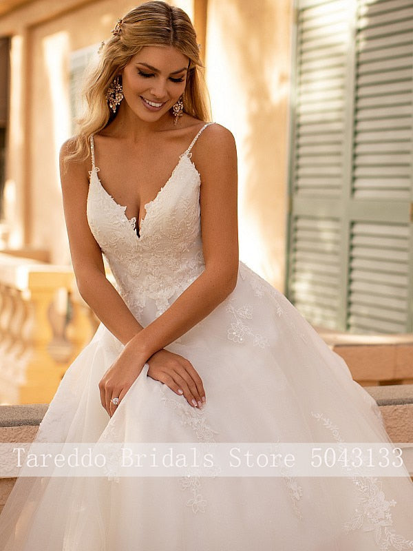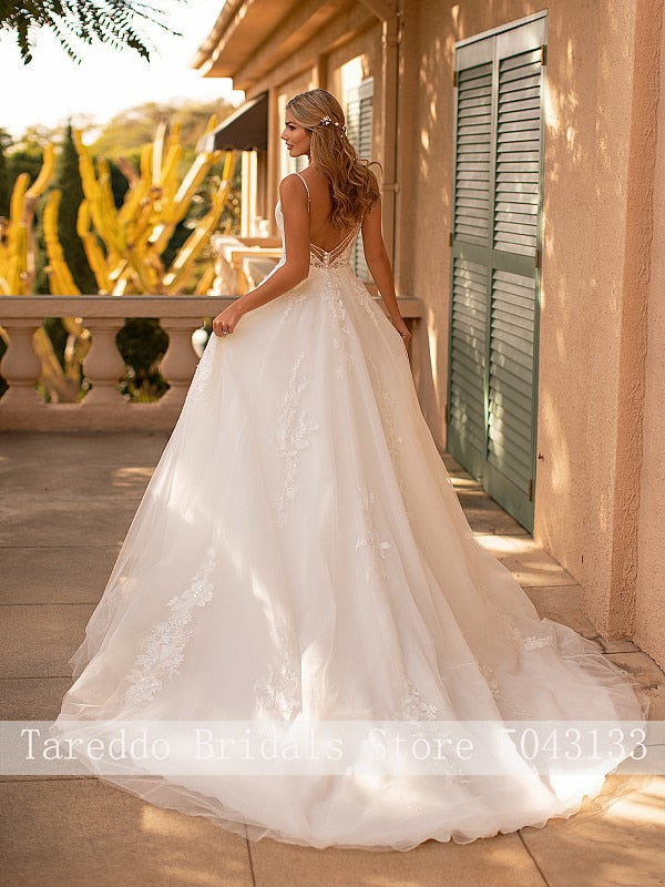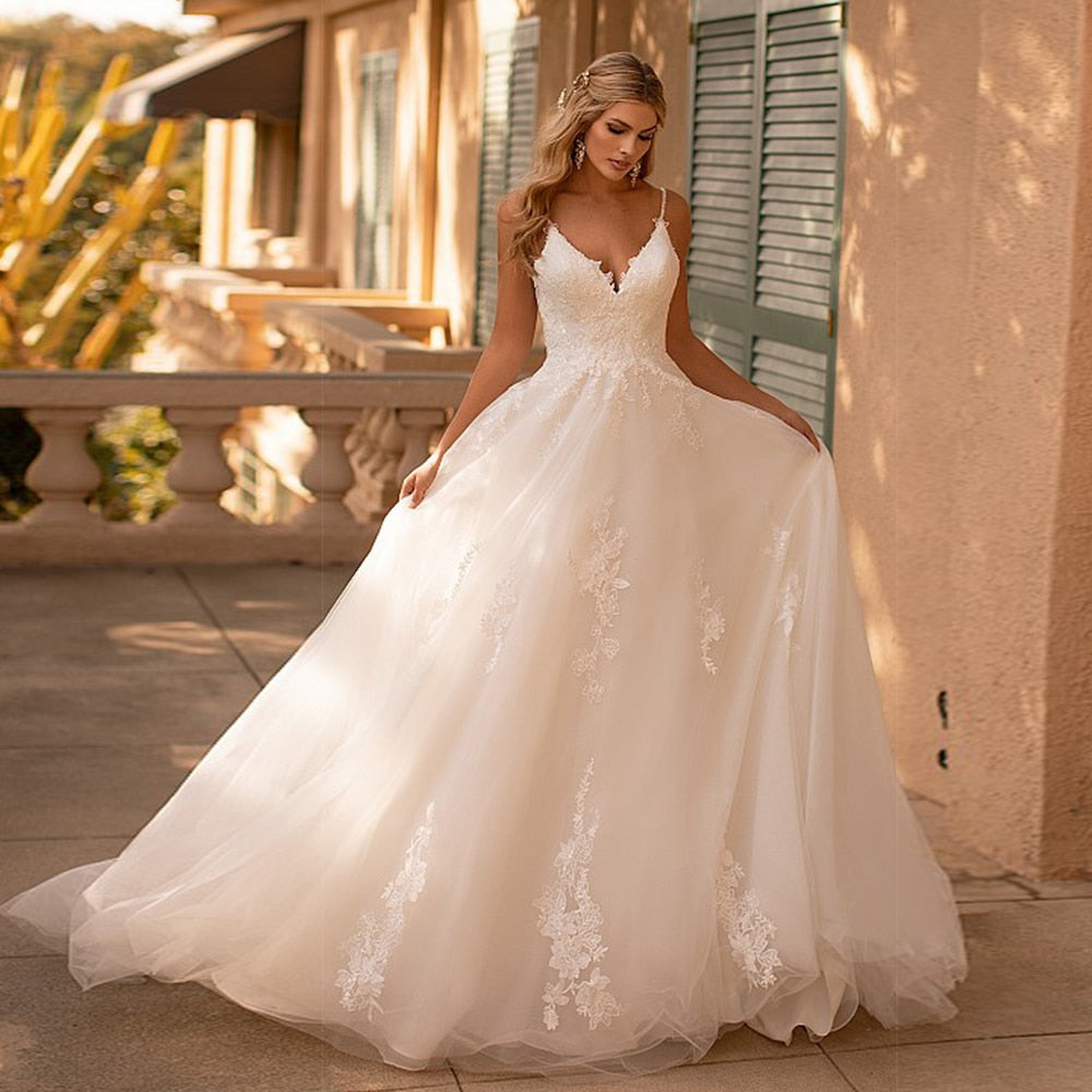 Roycebridal Lace Appliques A Line Spaghetti Straps Wedding Dresses 2021 V Neck Off the Shoulder Floor Length Tulle Backless Bridal Gowns