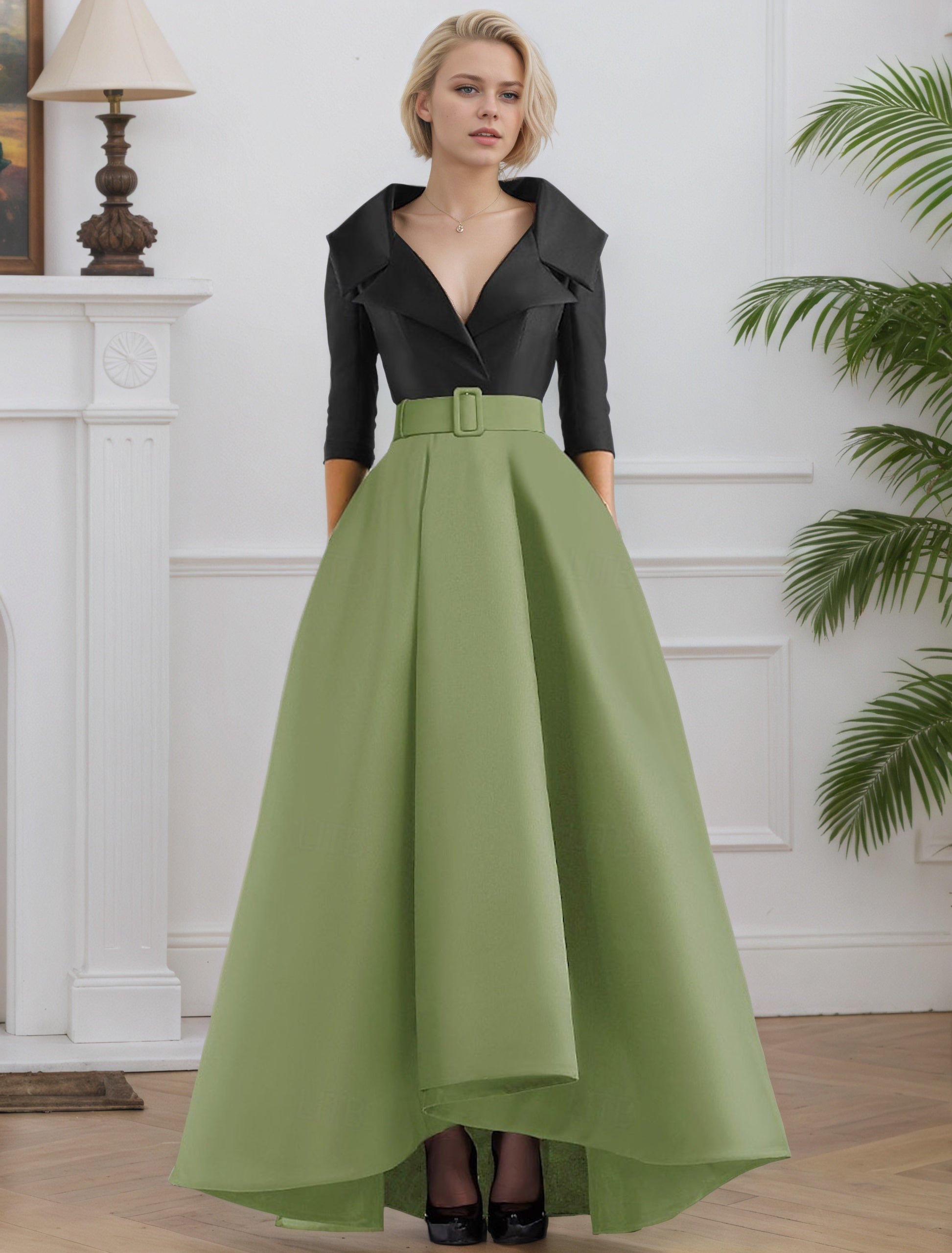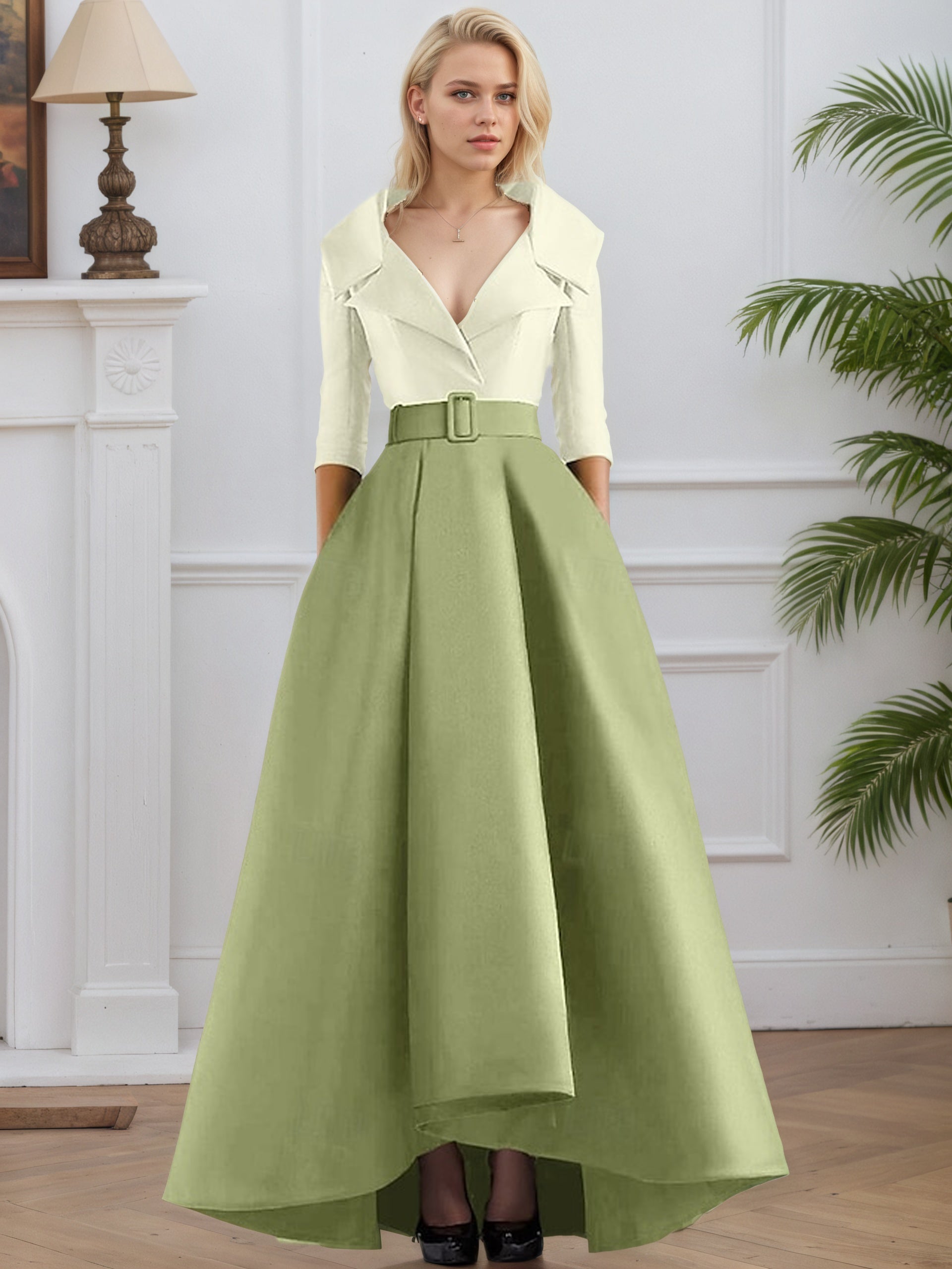 3/4 Length Sleeve Shirt Collar with Pocket Satin A Line Formal Evening Dresses