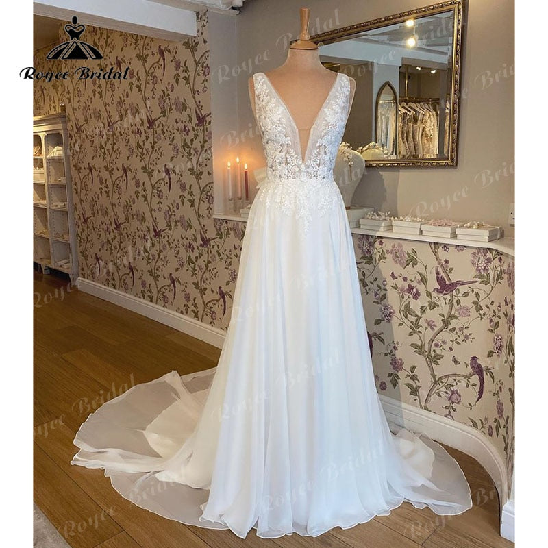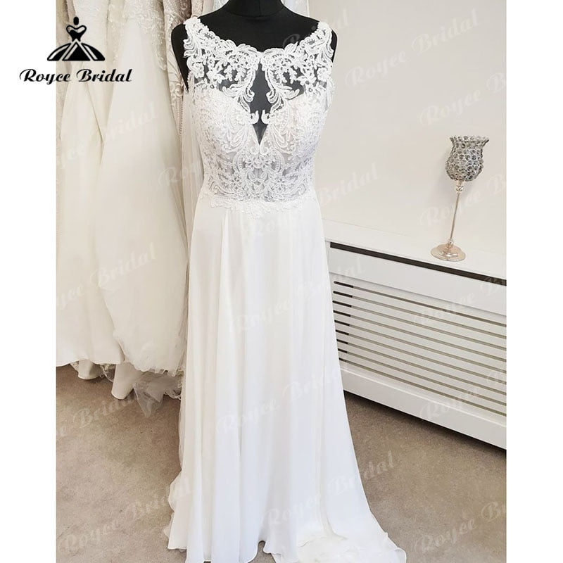 • Roycebridal A Line Scoop Neck Lace Wedding Dress Beach Appliques Chiffon Boho 2025 Backlesss Sexy Bridal Wedding Dresses Summer Elegant