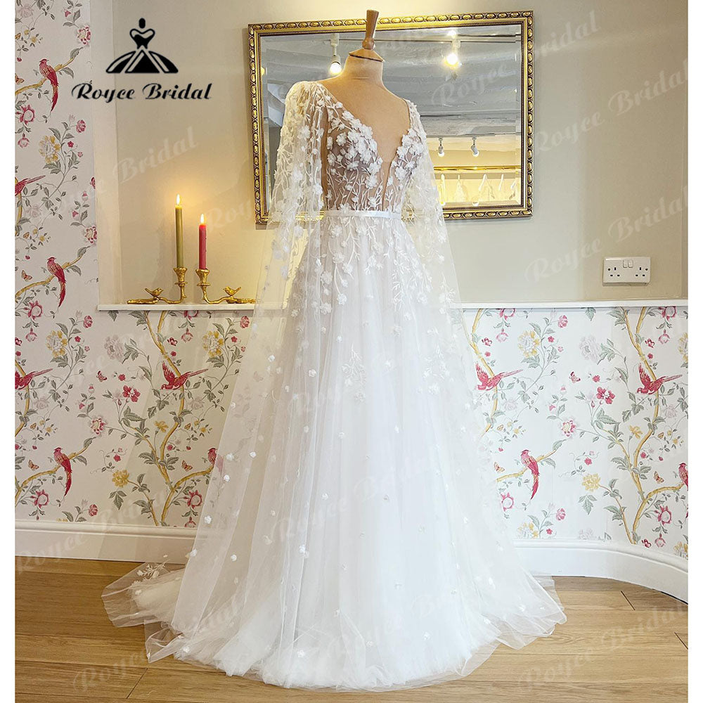 • Roycebridal 2022 Boho Wedding Dresses Detachable Long Puff Sleeve Bride Dress Vintage Lace Beach Wedding Gowns Plus Size Corset Back Sweet